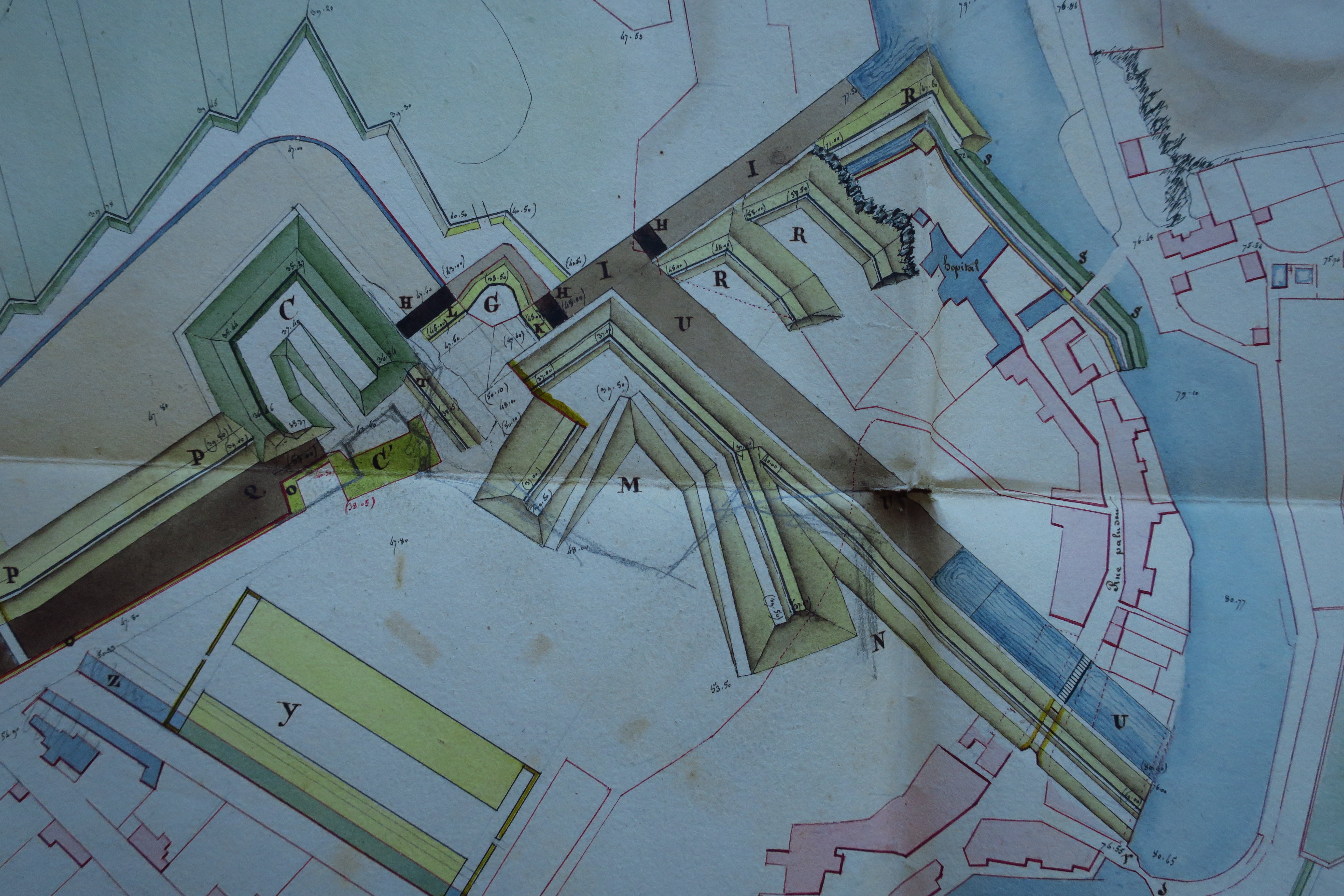Service historique de la Défense, département Armée de Terre, Vincennes. Archives du Génie ; Article 8, Places françaises et d'Algérie : 1 VH 289, Place de Belle-Île-en-Mer, projets et dépenses annuels, 1831-1836. Direction du Génie de Nantes, Place de Belle-isle-en-Mer, feuille n° 1 des projets pour 1831, projet d'ensemble pour la place de Palais, 1er mars 1831.