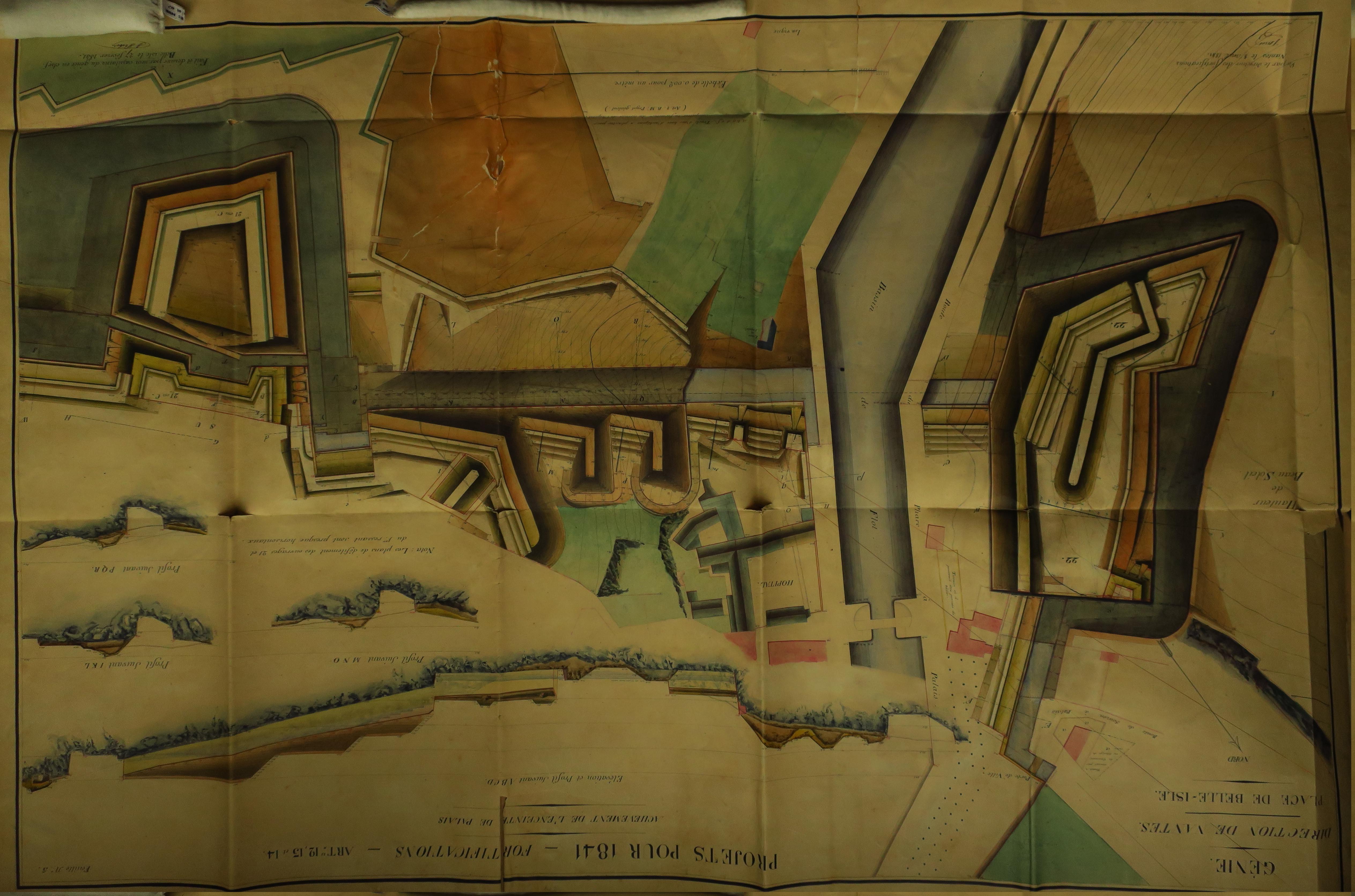 Service historique de la Défense, département Armée de Terre, Vincennes. Archives du Génie ; Article 8, Places françaises et d'Algérie : 1 VH 290, Place de Belle-Île-en-Mer, projets et dépenses annuels, 1837-1842. Direction du Génie de Nantes, Place de Belle-Ile, feuille n° 5 des projets pour 1841, achèvement de l'enceinte de Palais, 27 février 1841.