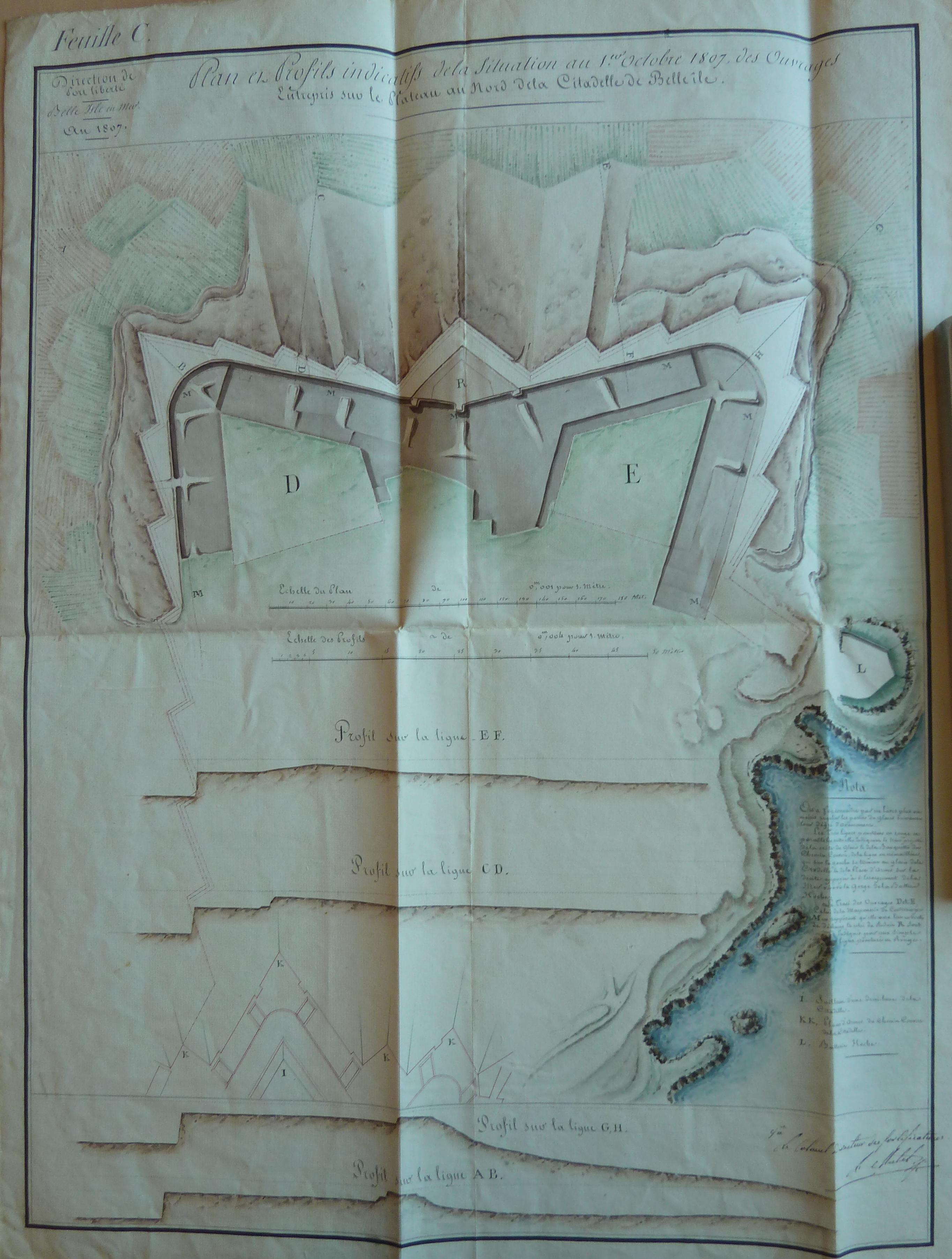 Service historique de la Défense, département Armée de Terre, Vincennes. Archives du Génie ; Article 8, Places françaises et d'Algérie : 1 VH 286, Place de Belle-Île-en-Mer, projets et dépenses annuels, 1807-1816. Direction du Génie de Port-Liberté, plan et profils indicatif de la situation au 1er janvier 1807 des ouvrages entrepris sur le plateau au nord de la citadelle de Belle-Île.