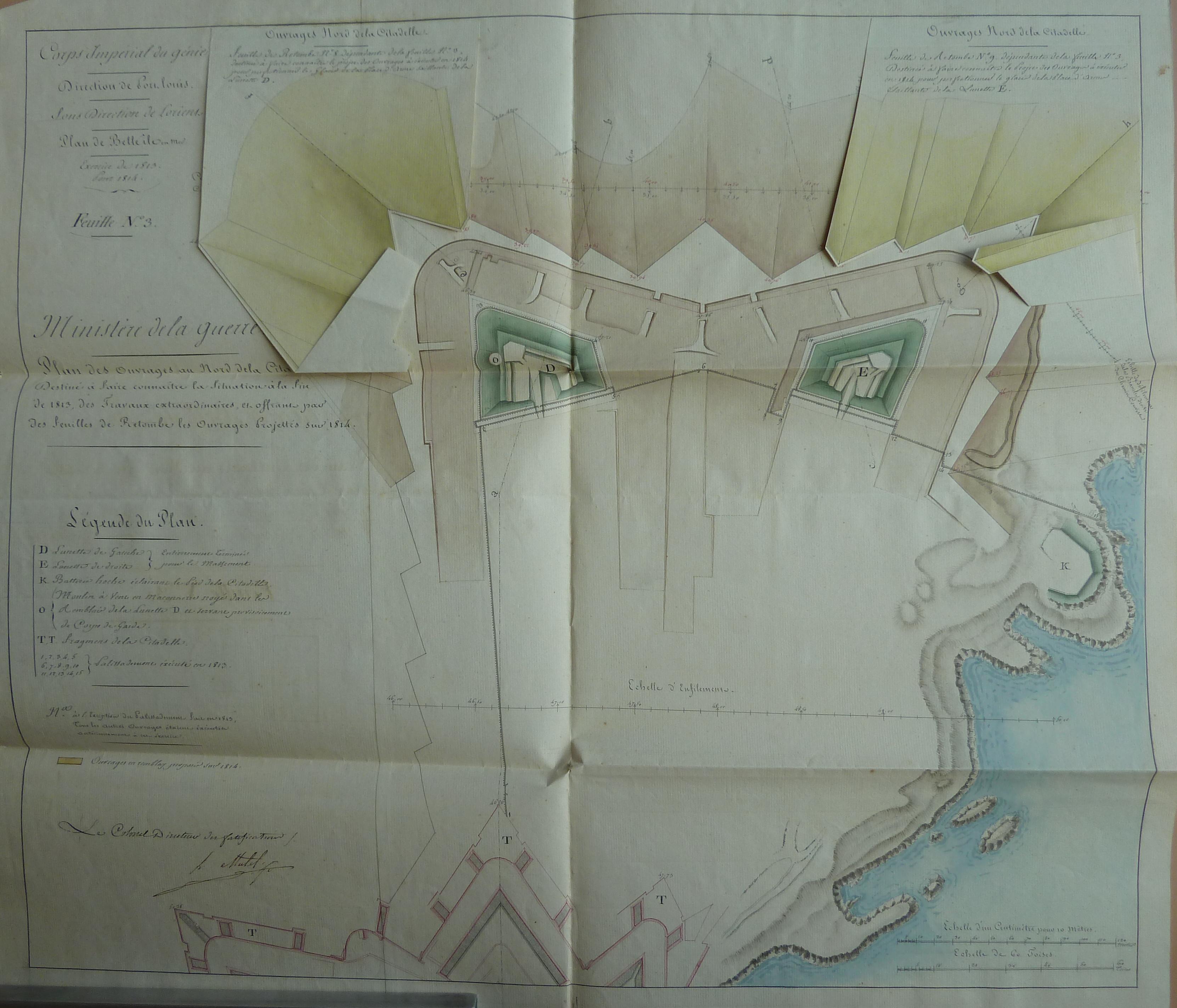 Service historique de la Défense, département Armée de Terre, Vincennes. Archives du Génie ; Article 8, Places françaises et d'Algérie : 1 VH 286, Place de Belle-Île-en-Mer, projets et dépenses annuels, 1807-1816. Direction du Génie de Port-Louis, Place de Belle-Ile, feuille n° 3 des projets pour 1814, plan des ouvrages au nord de la citadelle, 1813.