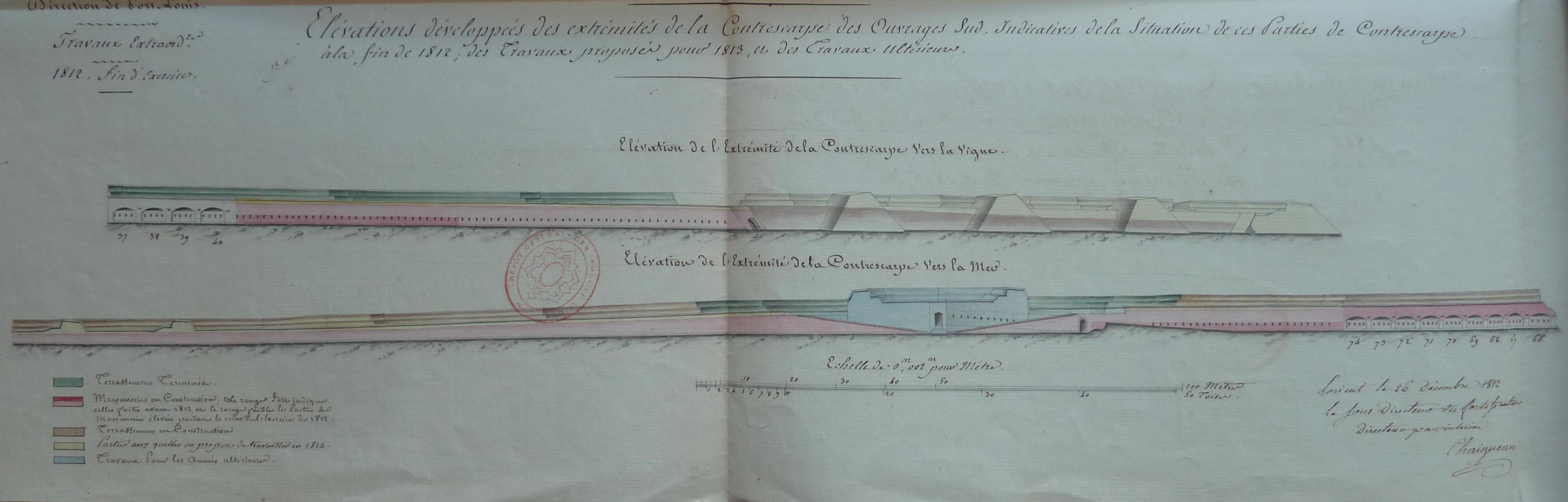 Service historique de la Défense, département Armée de Terre, Vincennes. Archives du Génie ; Article 8, Places françaises et d'Algérie : 1 VH 286, Place de Belle-Île-en-Mer, projets et dépenses annuels, 1807-1816. Direction du Génie de Port-Louis, Place de Belle-Ile-en-Mer, élévations développées des extrémités de la contrescarpe des ouvrages sud, indicatives de la situation de ces parties de contrescarpe à la fin de 1812, 26 décembre 1812.