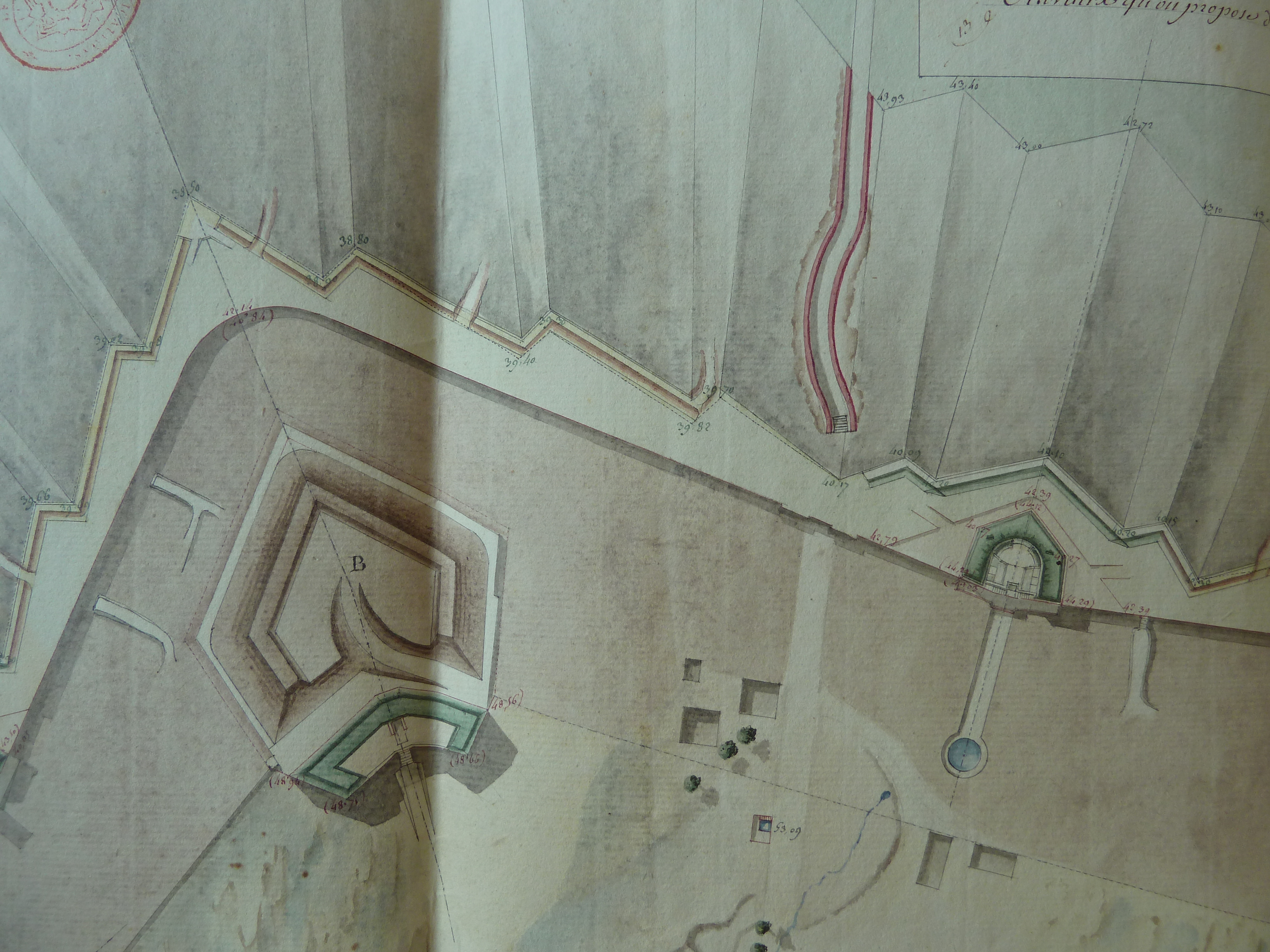 Service historique de la Défense, département Armée de Terre, Vincennes. Archives du Génie ; Article 8, Places françaises et d'Algérie : 1 VH 286, Place de Belle-Île-en-Mer, projets et dépenses annuels, 1807-1816. Direction du Génie de Port-Liberté, Place de Belle-isle-en-Mer, plan des ouvrages au sud de la citadelle, indicatif de la situation de ces ouvrages à la fin de 1812.