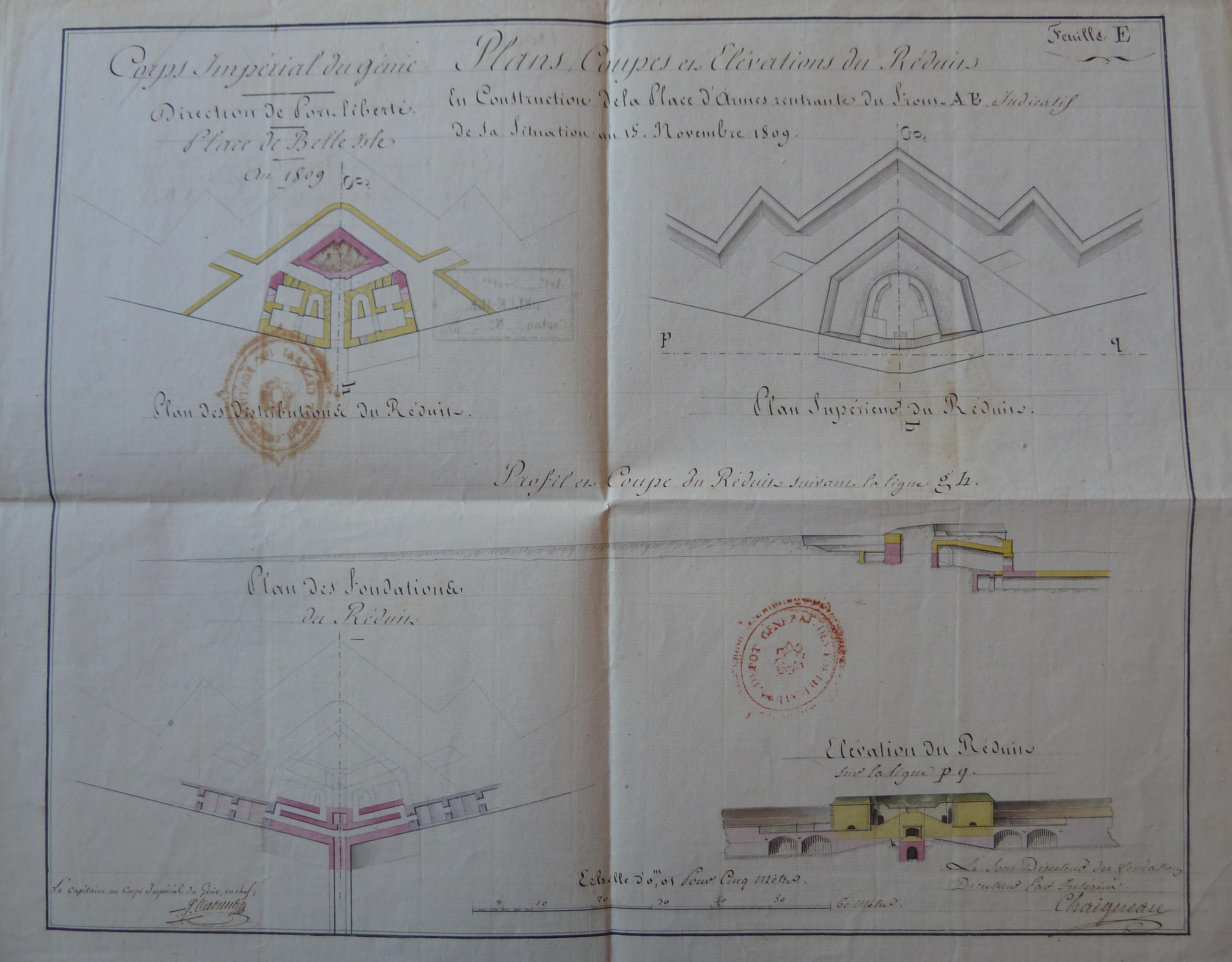 Service historique de la Défense, département Armée de Terre, Vincennes. Archives du Génie ; Article 8, Places françaises et d'Algérie : 1 VH 286, Place de Belle-Île-en-Mer, projets et dépenses annuels, 1807-1816. Direction du Génie de Port-Liberté, Place de Belle-Isle, plans, coupes et élévations du réduit en construction de la place d'armes rentrante du front AB indicatif de sa situation au 15 novembre 1809.