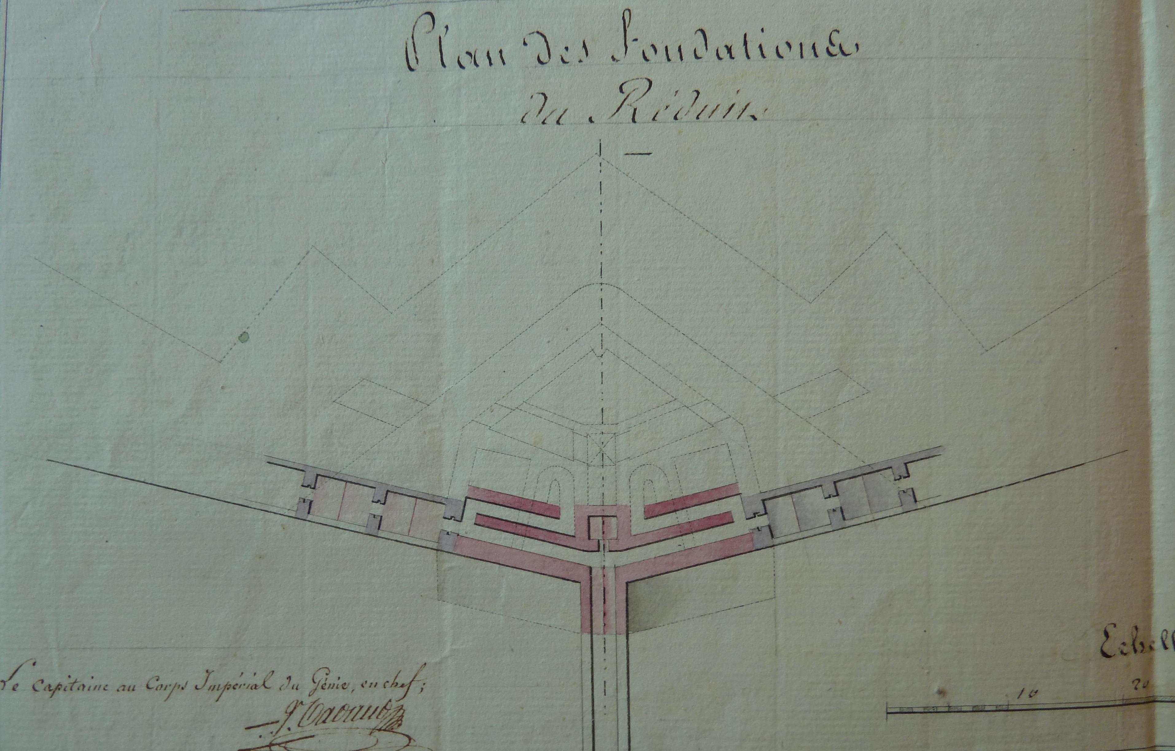 Service historique de la Défense, département Armée de Terre, Vincennes. Archives du Génie ; Article 8, Places françaises et d'Algérie : 1 VH 286, Place de Belle-Île-en-Mer, projets et dépenses annuels, 1807-1816. Direction du Génie de Port-Liberté, Place de Belle-Isle, plans, coupes et élévations du réduit en construction de la place d'armes rentrante du front AB indicatif de sa situation au 15 novembre 1809.