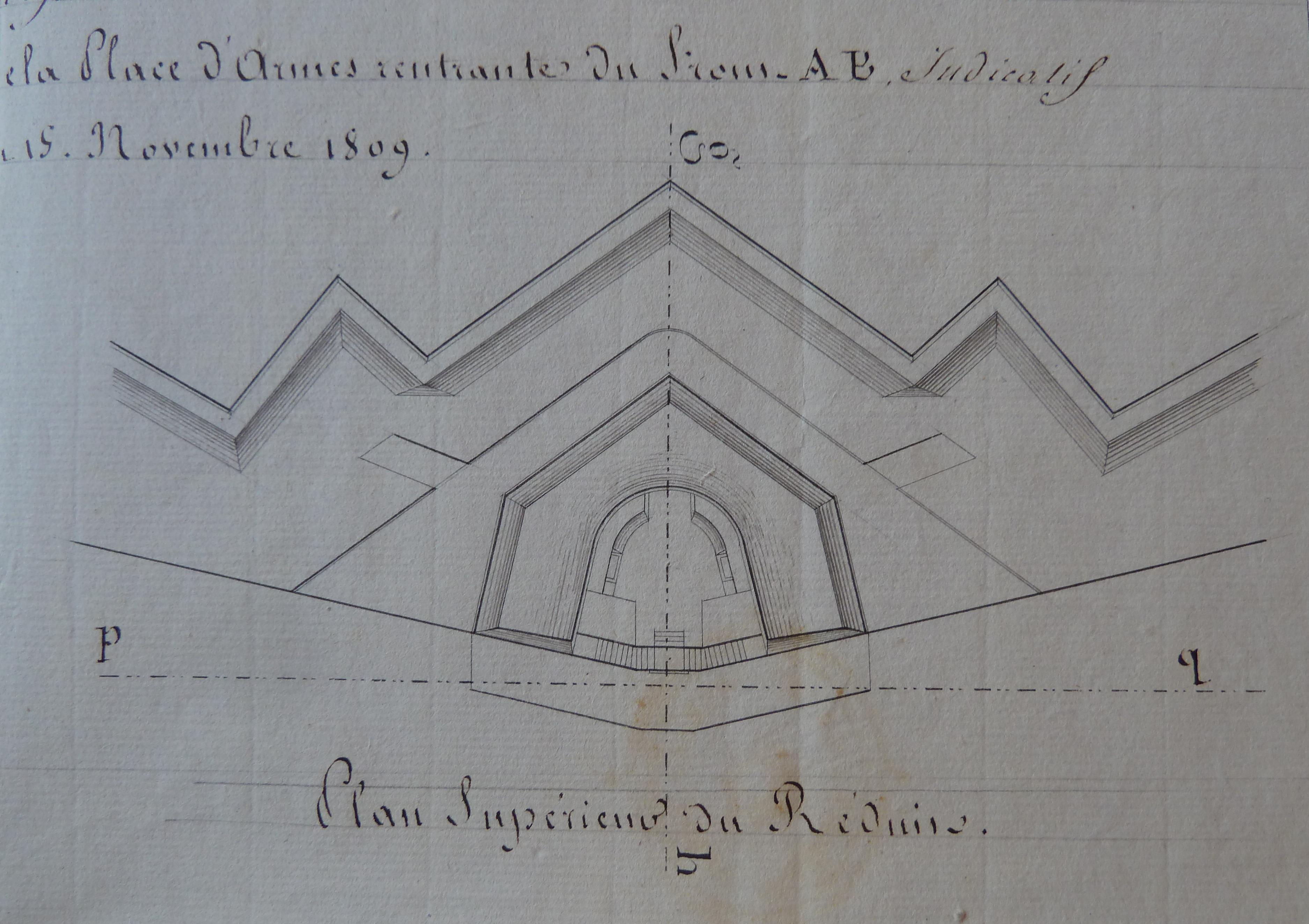 Service historique de la Défense, département Armée de Terre, Vincennes. Archives du Génie ; Article 8, Places françaises et d'Algérie : 1 VH 286, Place de Belle-Île-en-Mer, projets et dépenses annuels, 1807-1816. Direction du Génie de Port-Liberté, Place de Belle-Isle, plans, coupes et élévations du réduit en construction de la place d'armes rentrante du front AB indicatif de sa situation au 15 novembre 1809.