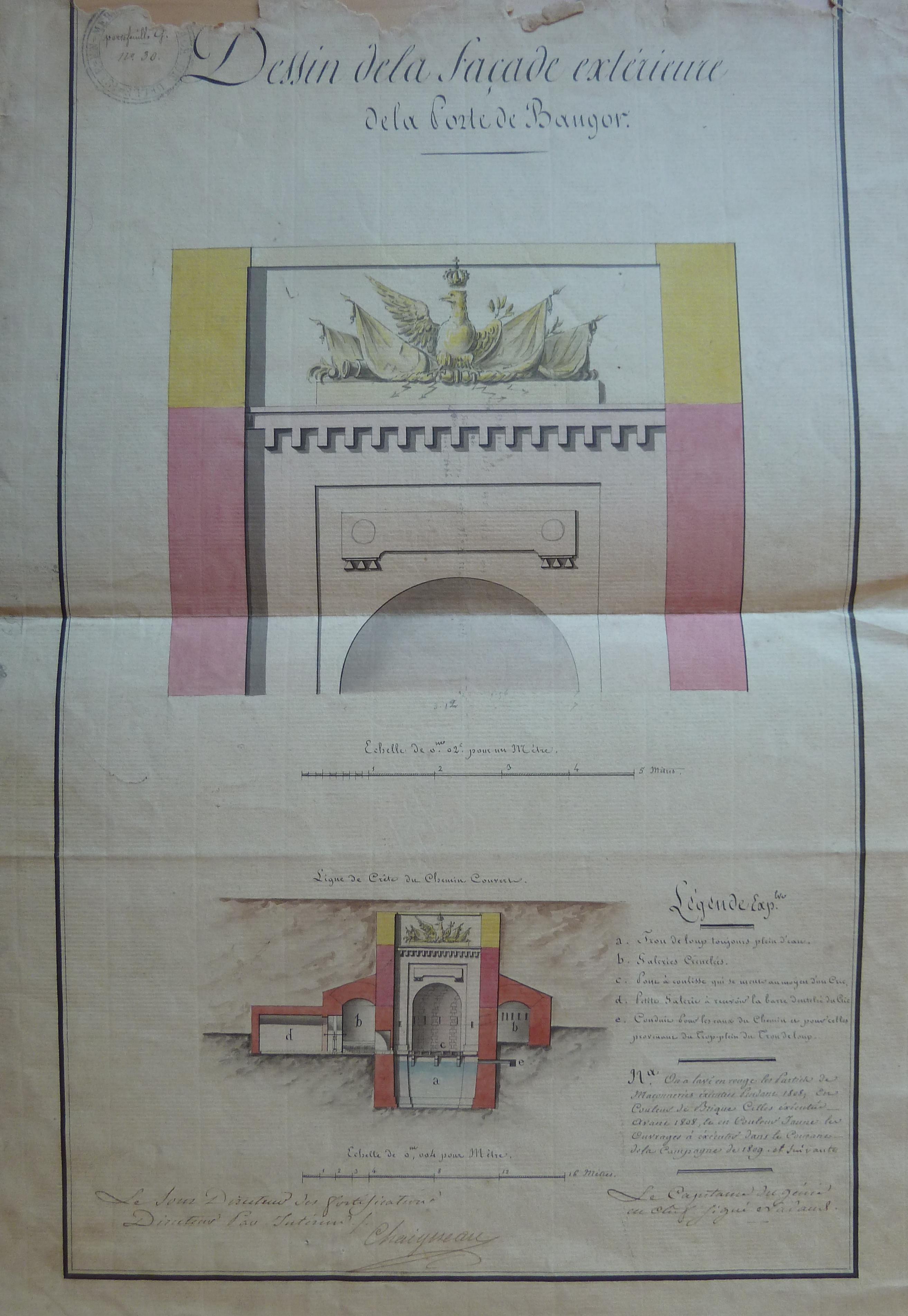 Service historique de la Défense, département Armée de Terre, Vincennes. Archives du Génie ; Article 8, Places françaises et d'Algérie : 1 VH 286, Place de Belle-Île-en-Mer, projets et dépenses annuels, 1807-1816. Direction du Génie de Port-Liberté, Place de Belle-Isle, dessin de la façade extérieure de la porte de Bangor, 1809.
