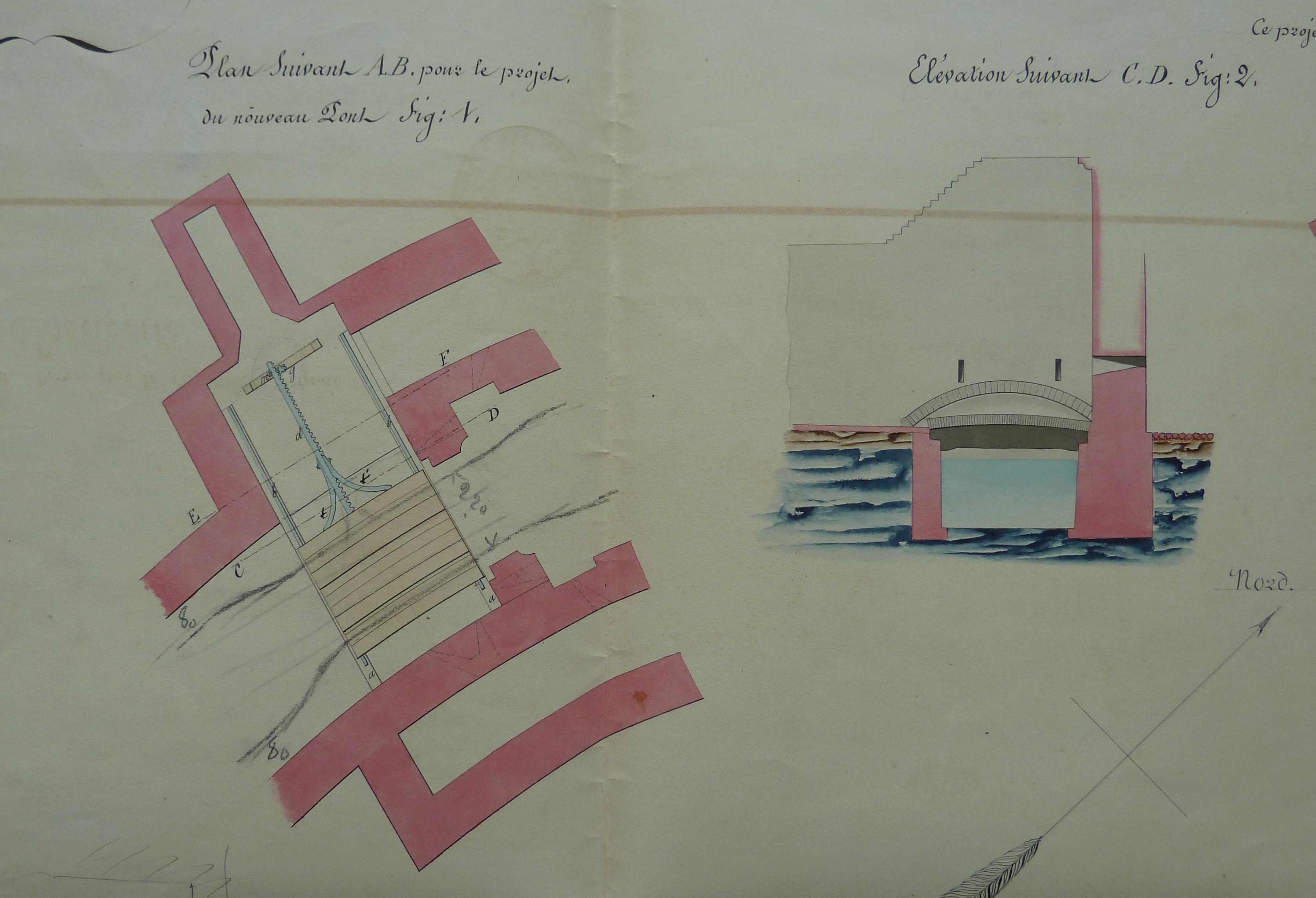 Service historique de la Défense, département Armée de Terre, Vincennes. Archives du Génie ; Article 8, Places françaises et d'Algérie : 1 VH 292, Place de Belle-Île-en-Mer, projets et dépenses annuels, 1847. Direction du Génie de Nantes, Place de Belle-Ile, feuille n° 29 des projets pour 1847, refaire le pont-levis de la porte Bangor, 23 mars 1847.