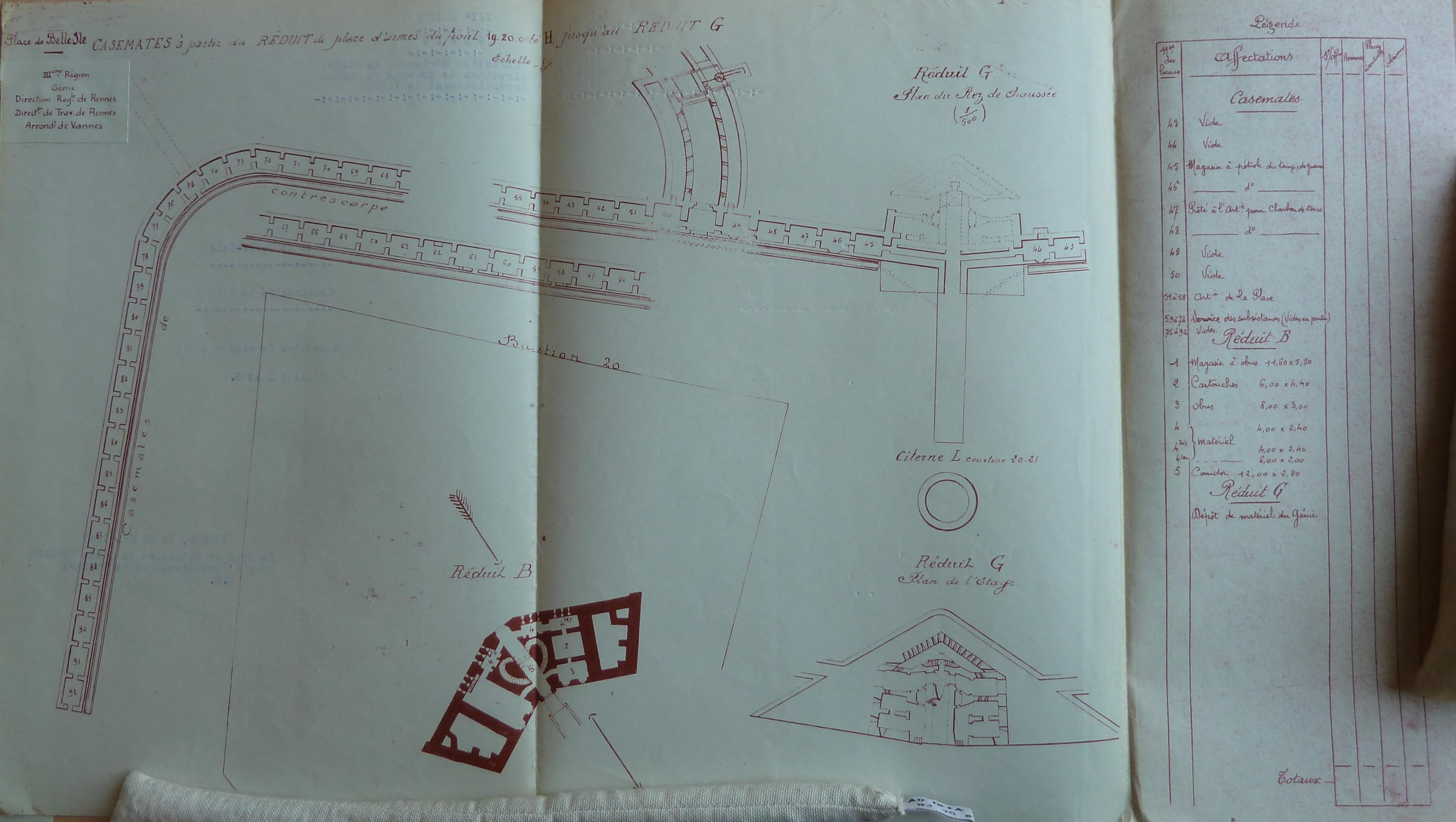 Service historique de la Défense, département Armée de Terre, Vincennes. Archives du Génie ; sous-série 3V, inspection du génie : 3 V 769, Commission de déclassement et d'aliénation d'ouvrages anciens, 1946-1947. Belle-Île, plan des casemates de contrescarpe et des réduits B et G.