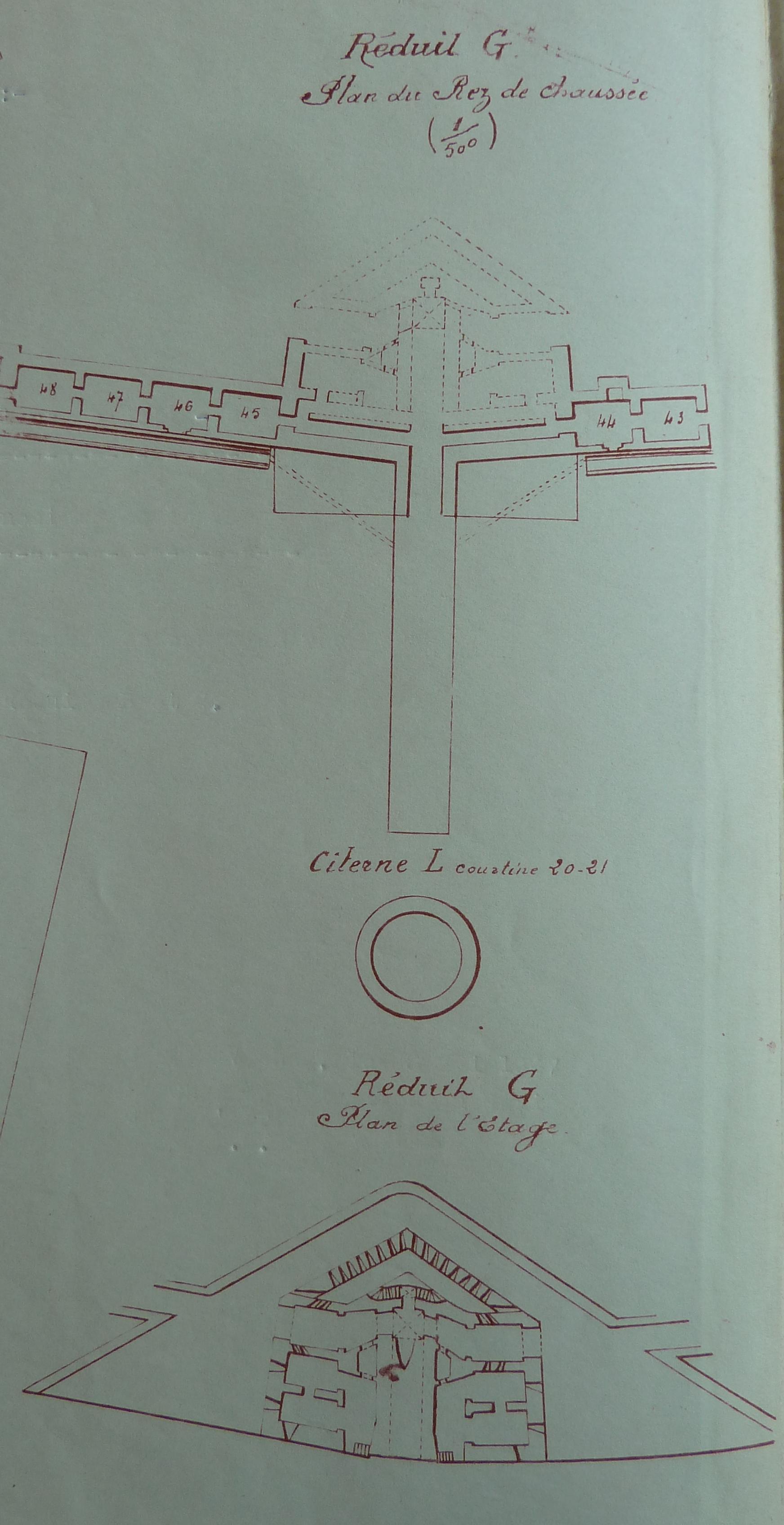 Service historique de la Défense, département Armée de Terre, Vincennes. Archives du Génie ; sous-série 3V, inspection du génie : 3 V 769, Commission de déclassement et d'aliénation d'ouvrages anciens, 1946-1947. Belle-Île, plan des casemates de contrescarpe et des réduits B et G.