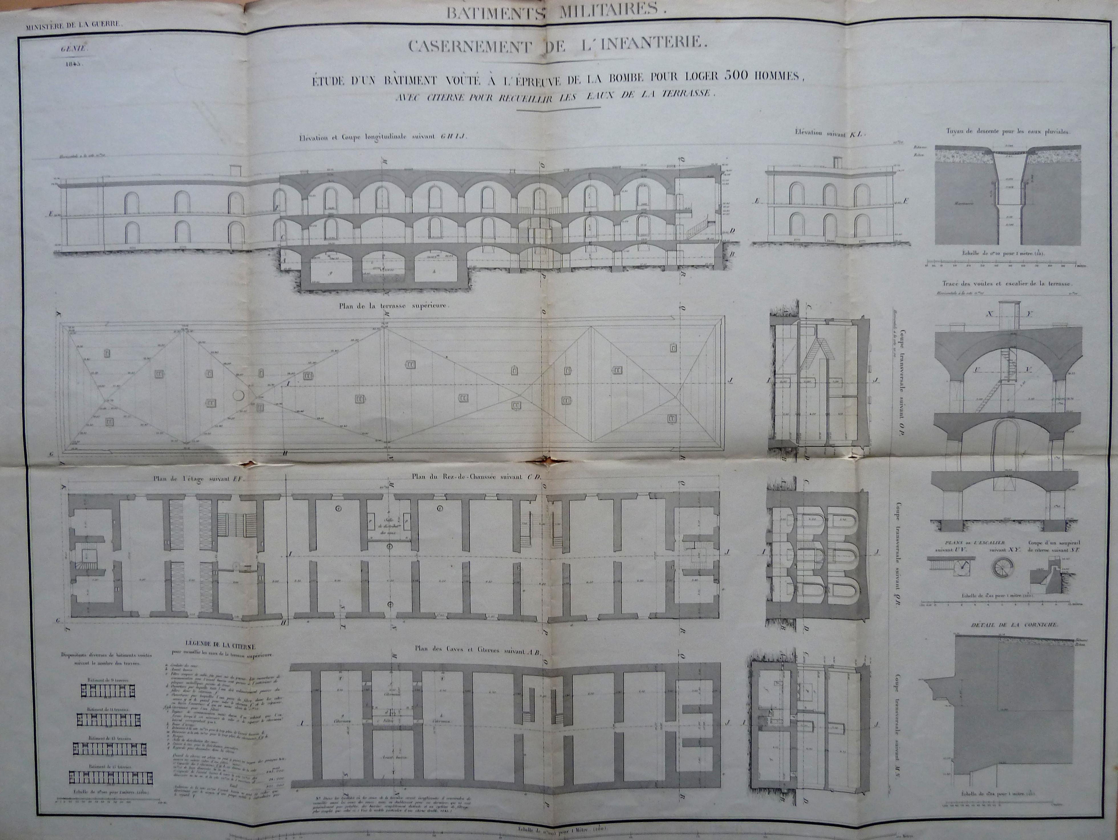 Service historique de la Défense, département Armée de Terre, Vincennes. Archives du Génie ; Article 12, Avis du Comité : 1 VK 139, Objets d'art : notes, mémoires et croquis de types (modèles) annexés aux avis du Comité du génie. Étude d'un bâtiment voûté à l'épreuve de la bombe pour loger 500 hommes, 1845.