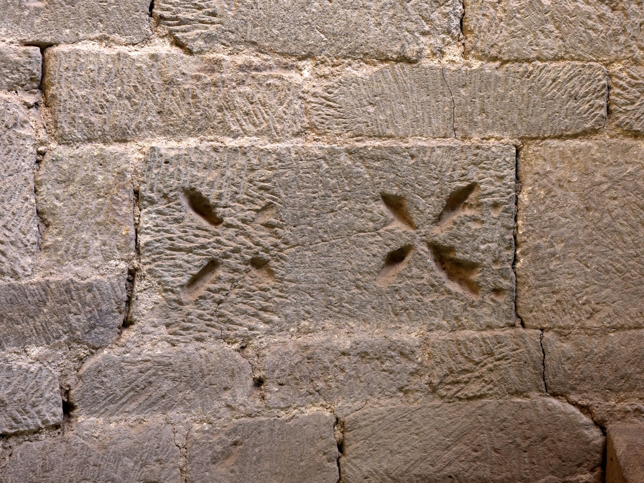 Tourelle d'escalier de la tour Hasting, détail d'une pierre sculptée et du parement. Les traces d'outils sont bien visiblesImmatriculation