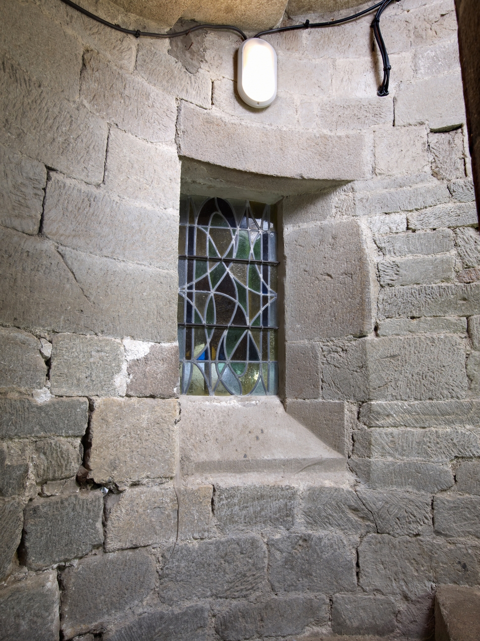 Tourelle d'escalier de la tour Hasting, détail d'un jour (donnant sur le cloître). La mise en oeuvre associe schiste tuffacé et graniteImmatriculation