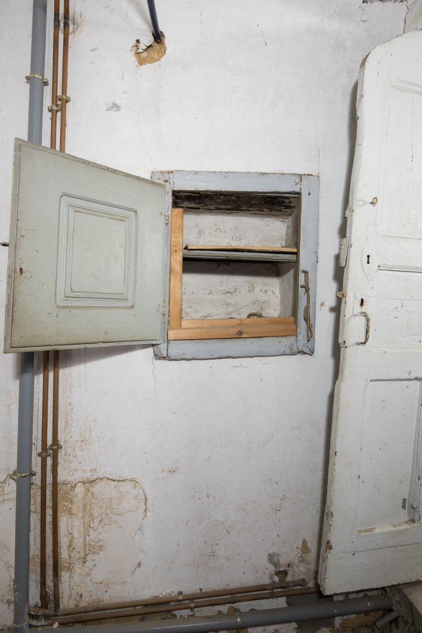 Logement secondaire construit en retour d'équerre. Détail d'une niche encastrée dans le mur, close d'un vantailImmatriculation