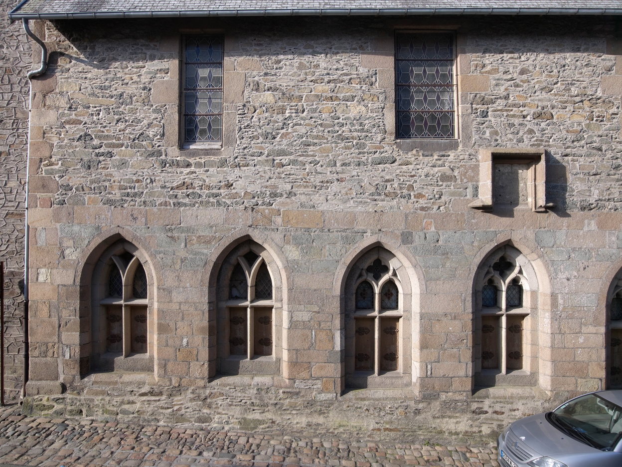 Rue La Chalotais. Ancien hôtel-Dieu du 15e siècle reconverti au 17e siècle en entrée du couvent et en choeur des soeurs à l'étage. Au rez-de-chaussée, baies gothiques avec réseaux refaits au 19e siècle. Bandeau à retours latéraux formant larmier pour protéger des armoiries aujourd'hui disparuesImmatriculation