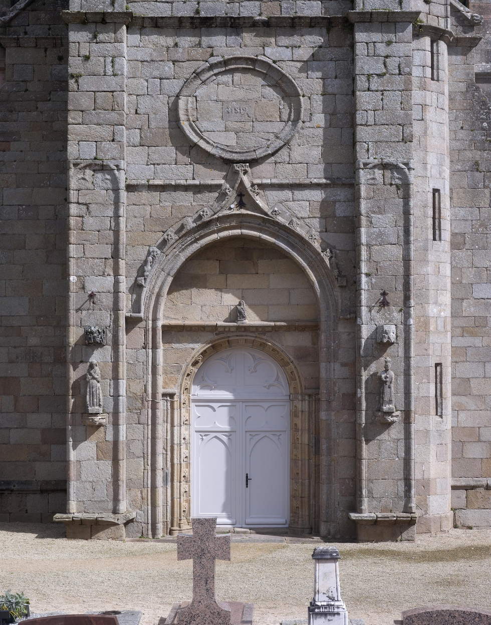Minihy-Tréguier, rue de l'Église : église Saint-Yves, élévation ouest, détail du porche. La reconstruction de la façade ouest et du clocher avec réemploi d'éléments anciens a été réalisée entre 1819 et 1824Immatriculation