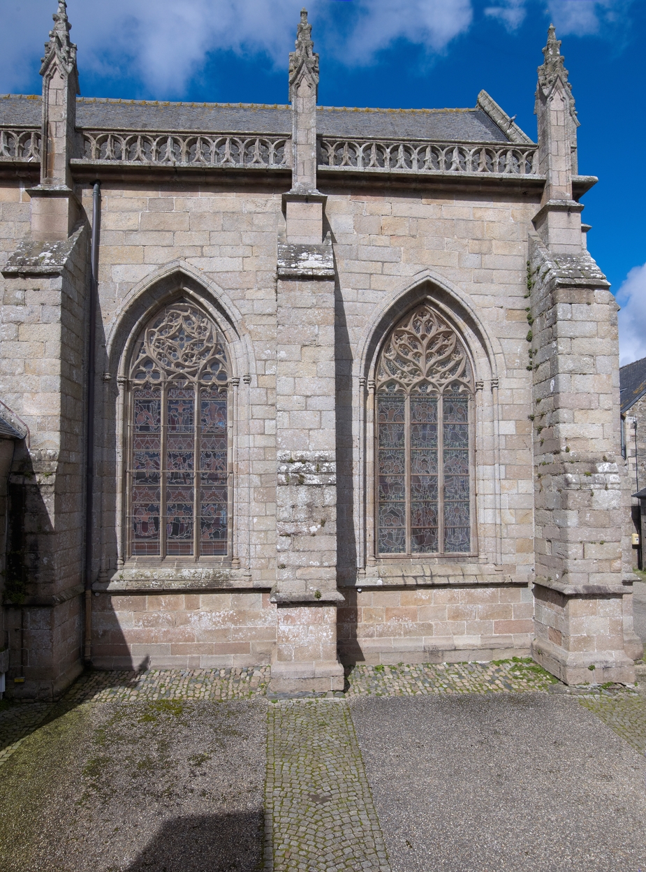 Minihy-Tréguier, rue de l'Église : église Saint-Yves, élévation sud, détail des baies réseau dense aux formes "timidement" flamboyantes. On peut voir le large cavet encadré de deux arcs à minces colonnettes (à signaler, les bases en flacons et les chapiteaux à bourrelets végétaux)Immatriculation