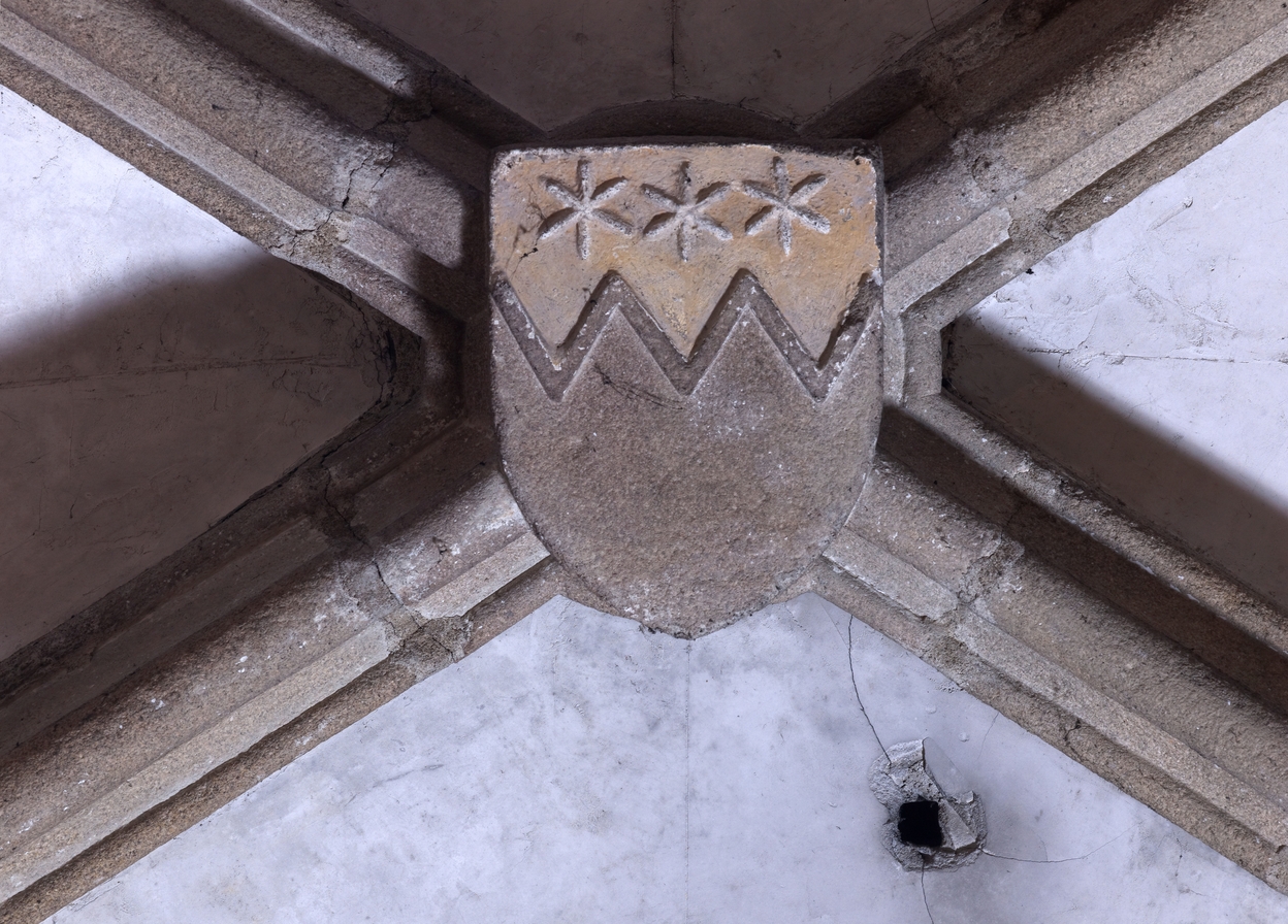 Minihy-Tréguier, rue de l'Église : église Saint-Yves, détail d'une clé de voûte armoriée. On peut identifier l'écu de Guillaume Touronce, l’official qui blasonne "de gueules au chef endenché d’or chargé de trois étoiles de sable"Immatriculation