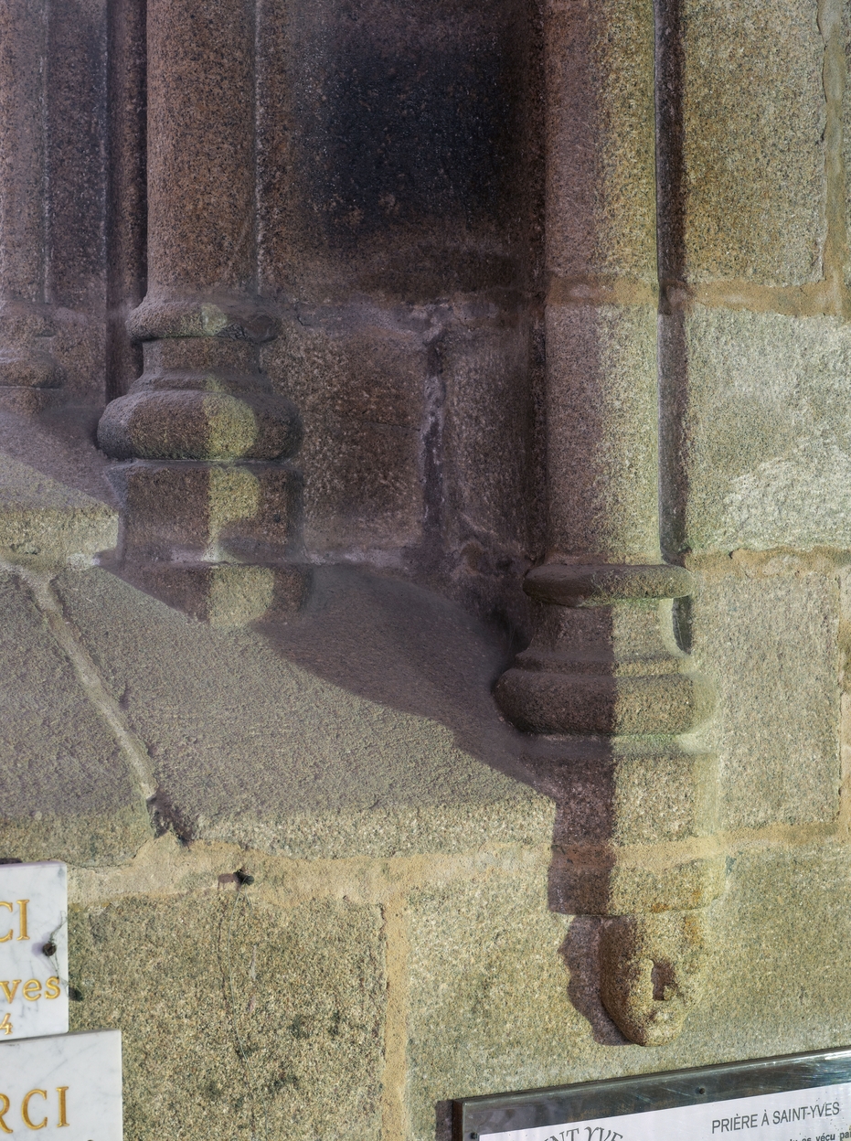 Minihy-Tréguier, rue de l'Église : église Saint-Yves, mur nord, détail de l'un des ébrasements de fenêtres, bases en flacons et tête sculptéeImmatriculation