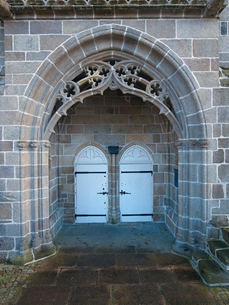 Minihy-Tréguier, rue de l'Église : église Saint-Yves, élévation nord, détail du porche. L'arcade à colonnettes est surmontée d'un lambrequin ajouré : deux larges mouchettes affrontées traitées en orbevoies déterminent une accolade sous la pointe de laquelle apparait une feuille de fougère stylisée et la tête d’un minuscule animalImmatriculation