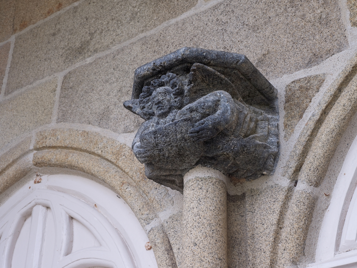 Minihy-Tréguier, rue de l'Église : église Saint-Yves, élévation nord, porche, détail du culot en "tuffeau vert" sculpté d’un ange tenant un écu buchéImmatriculation