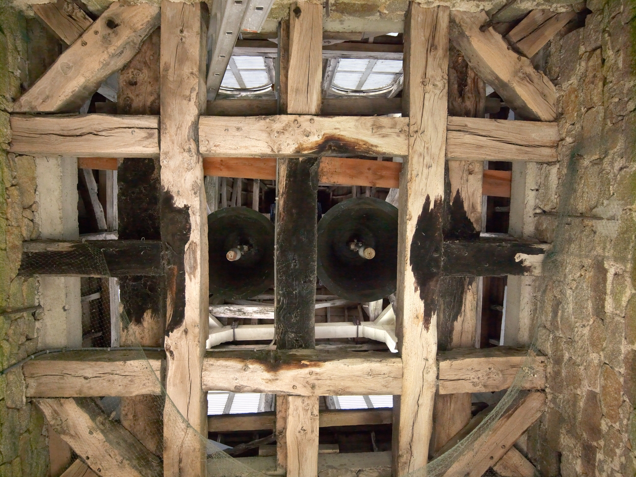 Vue des cloches depuis l'intérieur du clocher de l'église.Immatriculation
