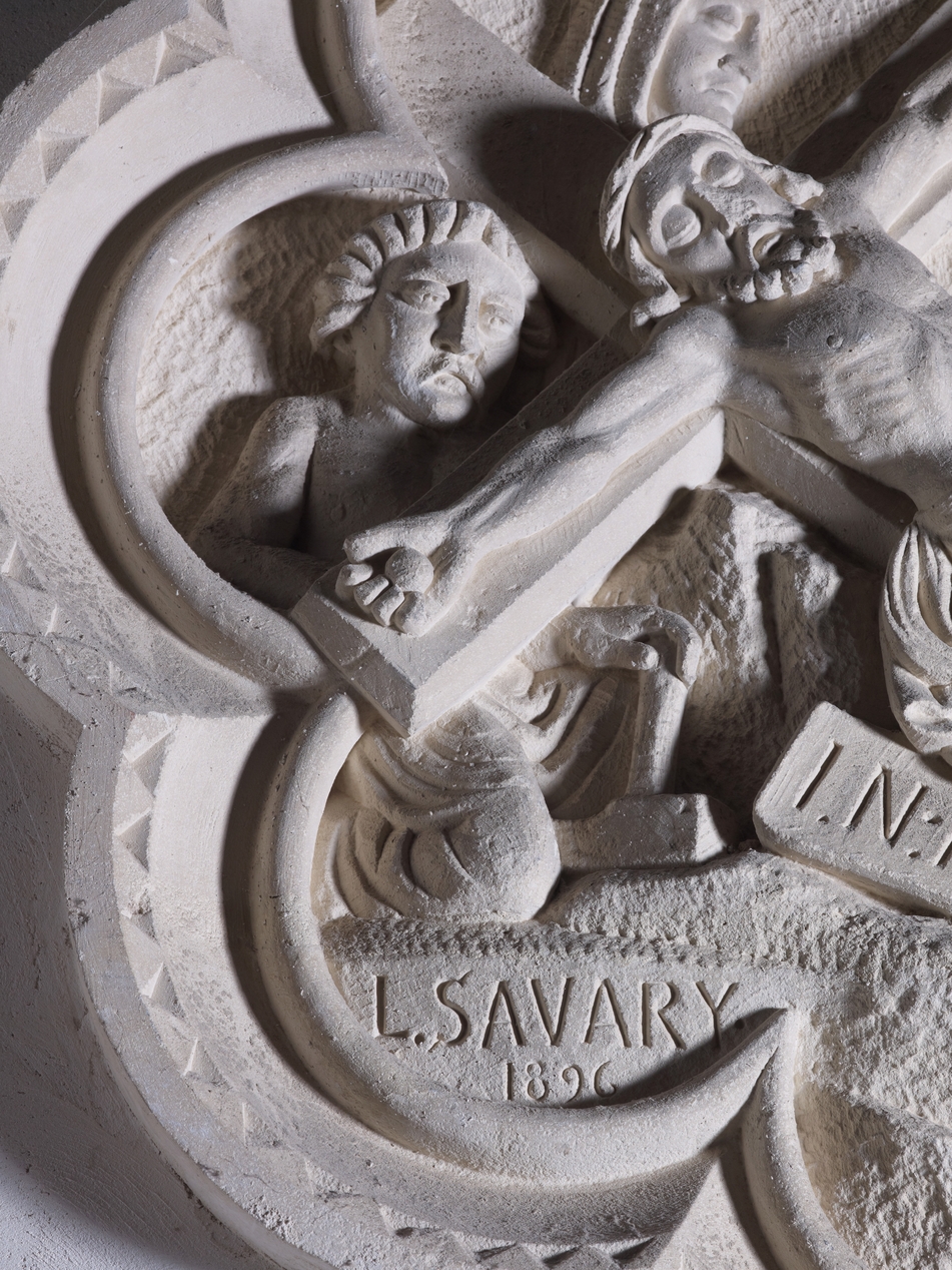 Tréguier, place de la République : chapelle du Petit Séminaire aujourd'hui Théâtre de l'Arche, détail de la signature du chemin de croix par Louis Savary daté 1896Immatriculation