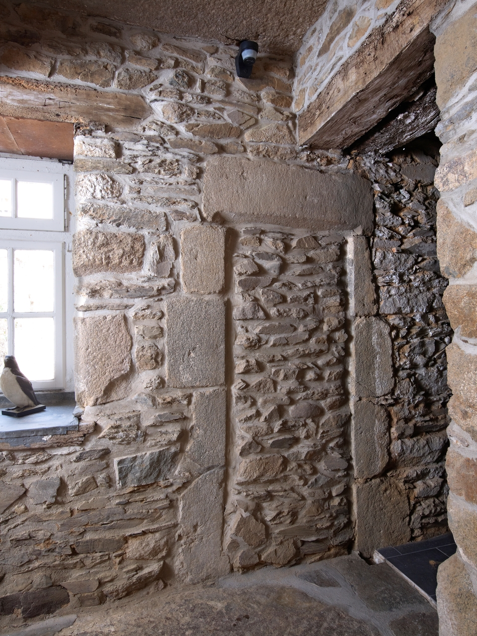 Tour d'escalier. Deuxième palier intermédiaire, à mi-étage. Porte bouchée donnant peut-être à l'origine sur des latrines. Echappée à droite vers les latrinesImmatriculation