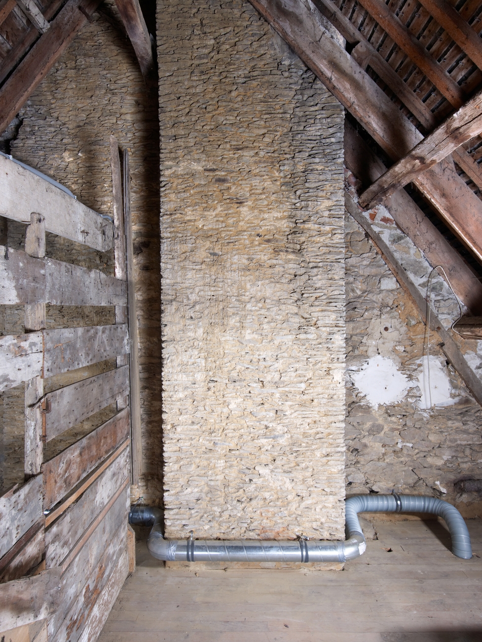 Combles. Pignon sud. Conduit de cheminée en petits moellons de schiste.Immatriculation