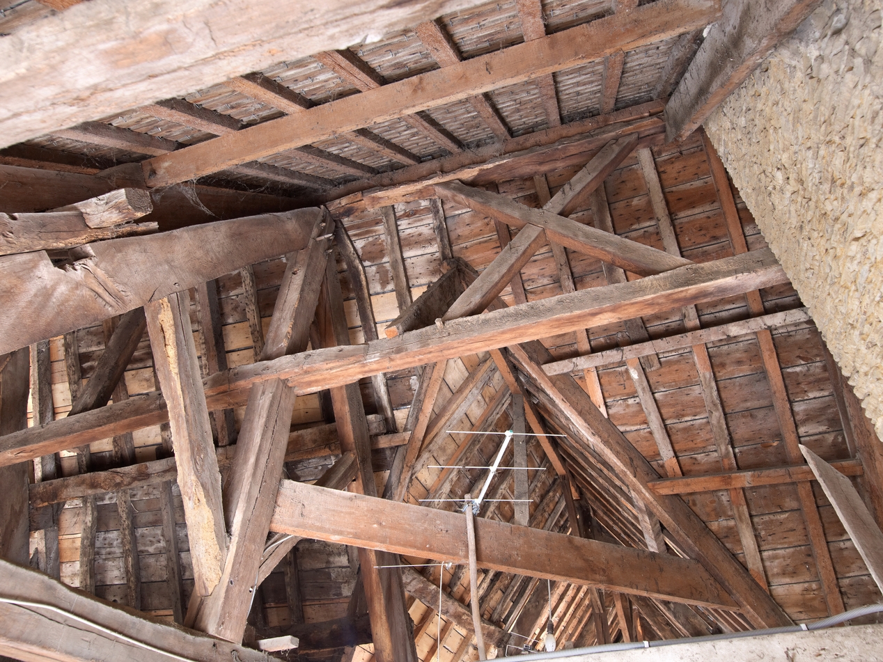 Charpente à sous-faitage en croix de saint André. Noue de la tour d'escalier.Immatriculation