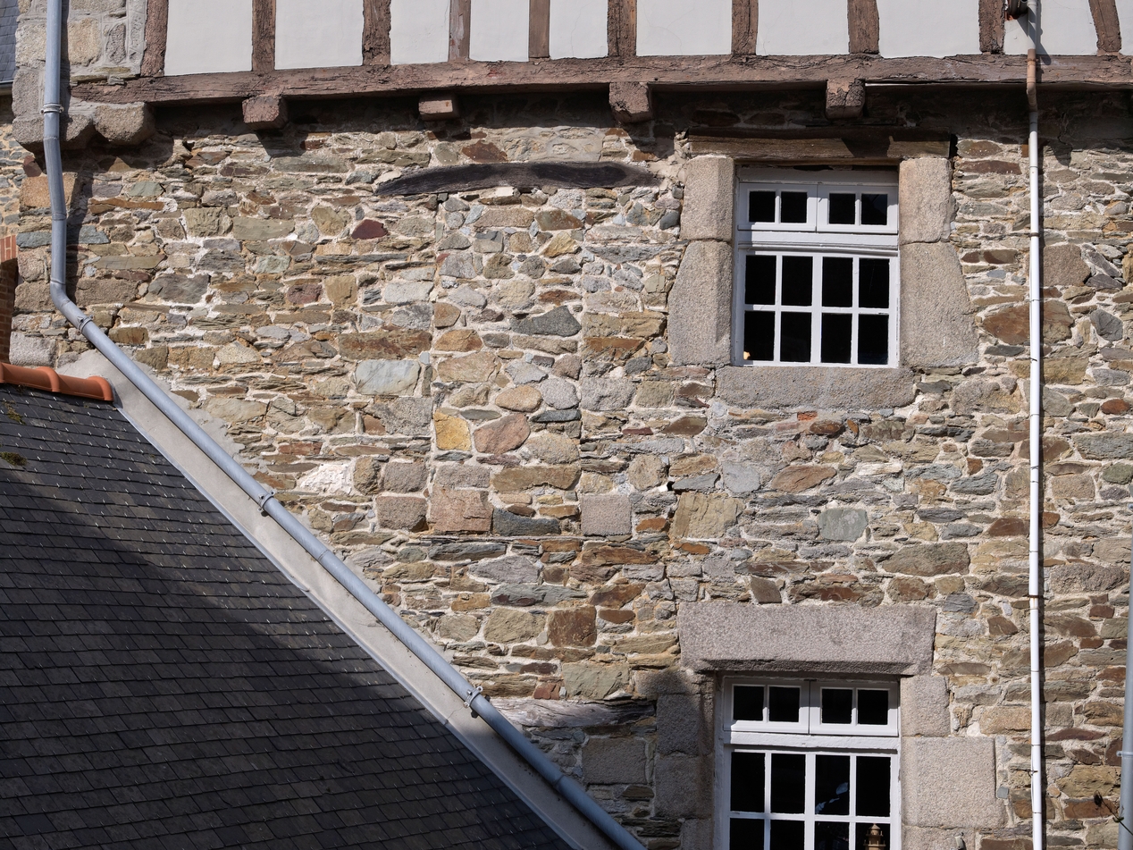 Tour d'escalier. Détail des fenêtres éclairant les paliers intermédiaires et d'une porte bouchée donnant peut-être accès à des latrines construites en surplomb.Immatriculation