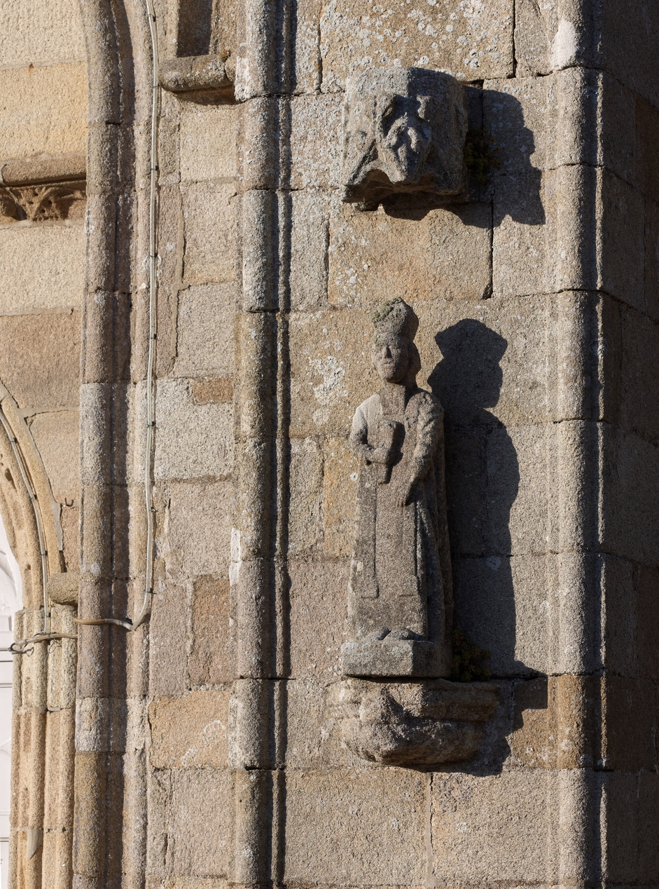 Minihy-Tréguier, rue de l'Église : église Saint-Yves, élévation ouest, porche, détail d'une statue, saint évêque, sous un dais gothique (remploi d'éléments anciens)Immatriculation