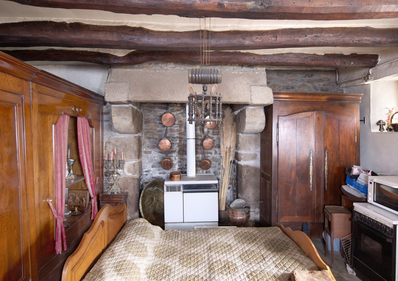 Minihy-Tréguier, Kerprigent : logis de ferme, grande salle est avec mobilier ancien en place dont un lit-clos transformé en étagère. Au fond, cheminée engagé dans le pignon estImmatriculation