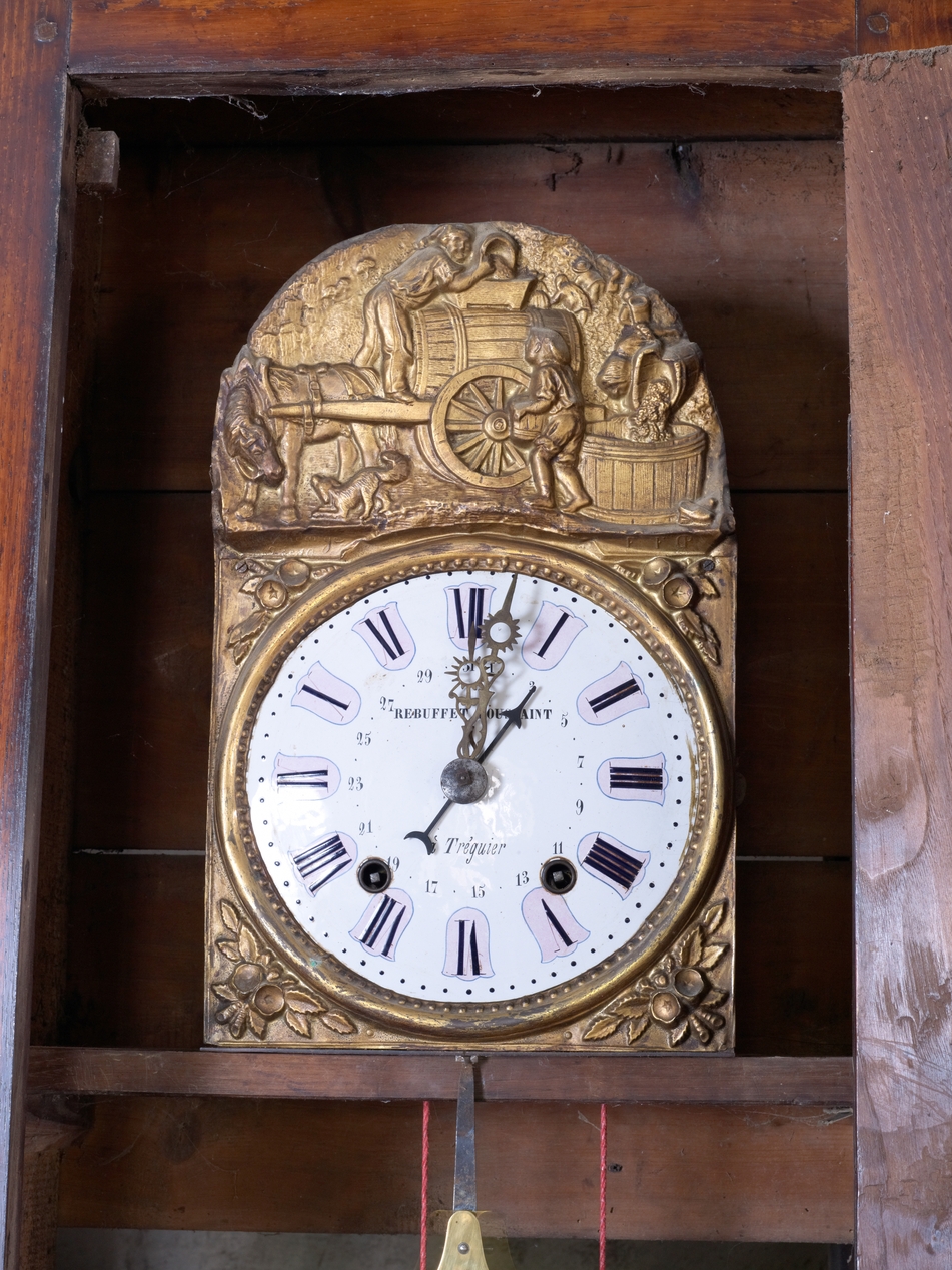 Minihy-Tréguier, Kerprigent : logis de ferme, grande salle est avec mobilier ancien en place dont une horloge fabriquée à Tréguier par Toussaint RebuffetImmatriculation