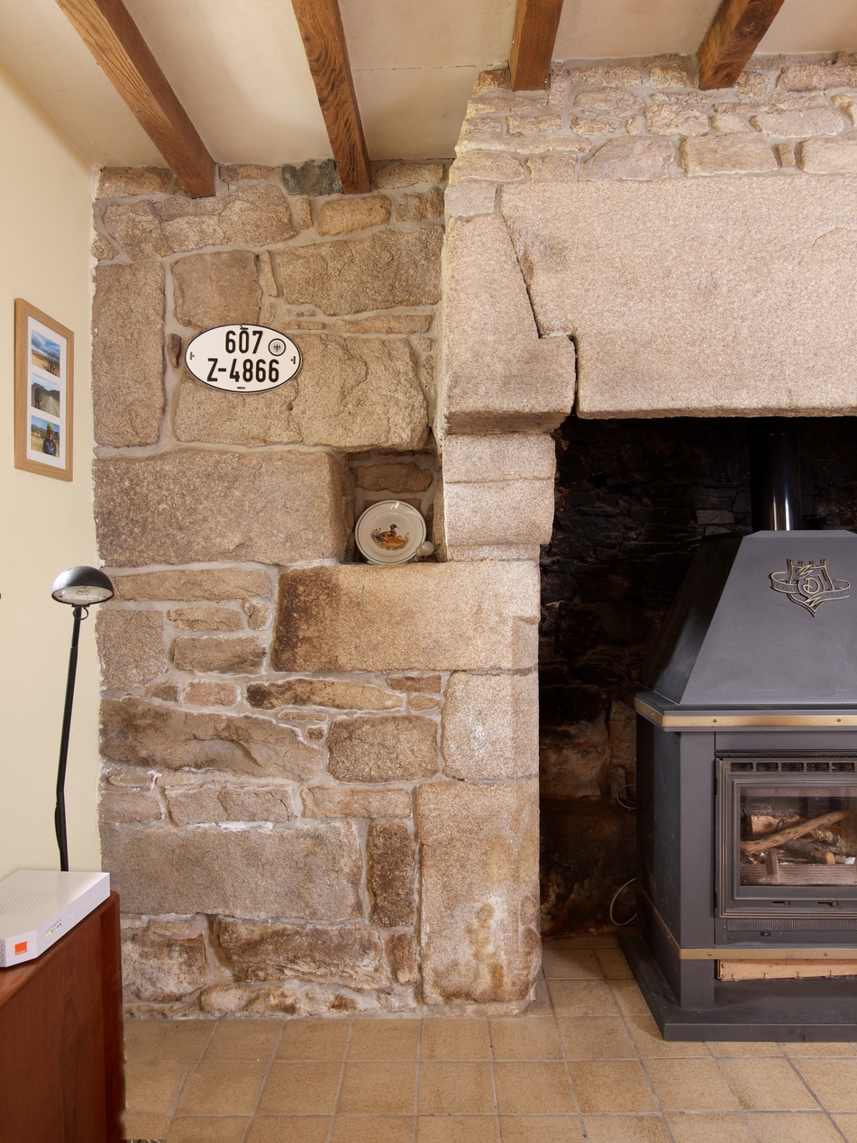 Ploubezre, Convenant Le Moal. Logis daté 1759. Cheminée du rez-de-chaussée. Détail d'un piédroitImmatriculation