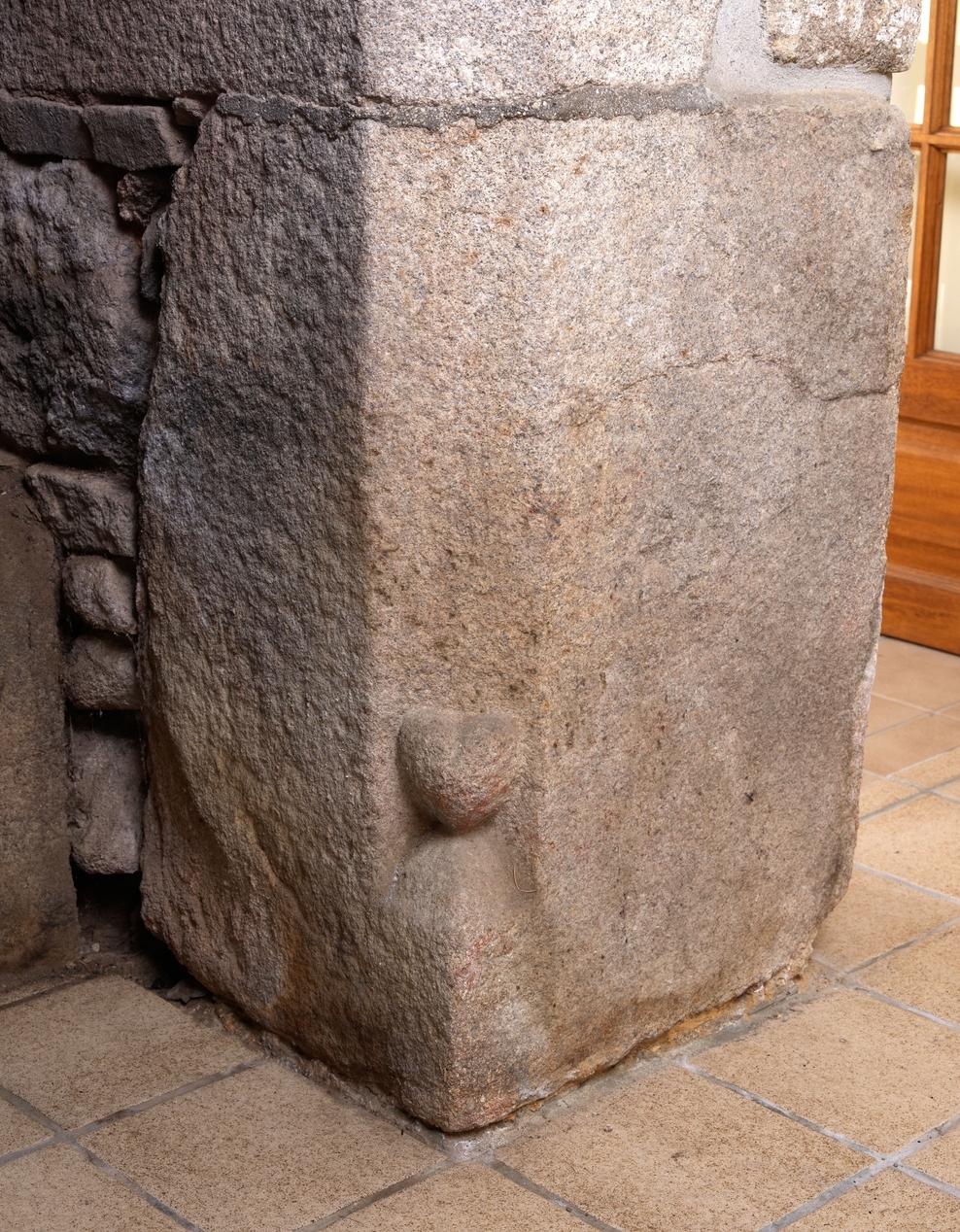 Ploubezre, Convenant Le Moal. Logis daté 1759. Cheminée du rez-de-chaussée. Détail d'un piédroit chanfreiné à congé orné d'un coeur avec trace d'ocre rougeImmatriculation