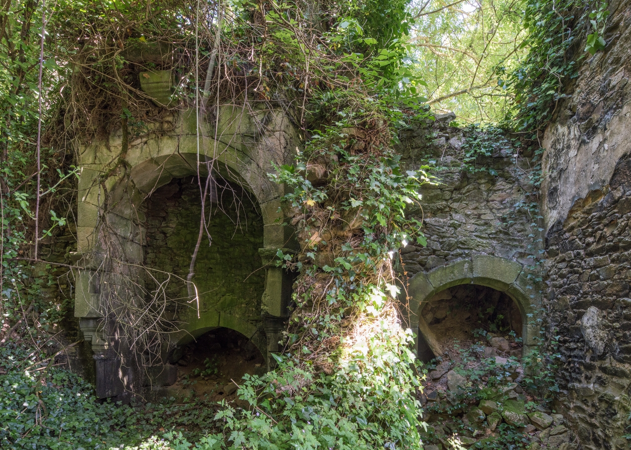 Le château : vue intérieure, partie est, vestiges des cheminéesImmatriculation
