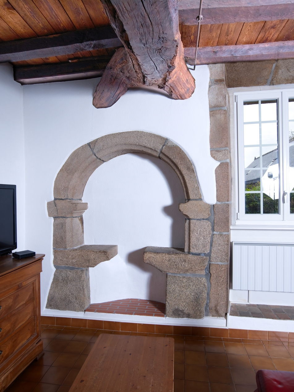 Rez-de-chaussée, cuisine (?) actuellement salle à manger, vaisselier mural aménagé dans l'épaisseur du mur ouest et fenêtre. A signaler, une poutre qui a gardé la forme d'origine de l'arbre...Immatriculation