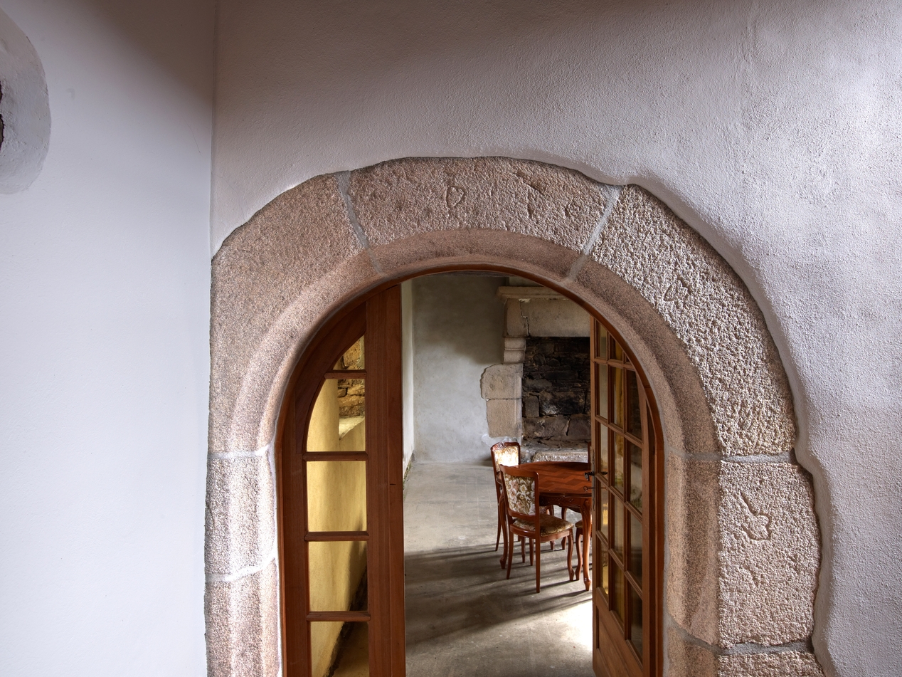 Rez-de-chaussée, salle basse actuellement vestibule, porte en arc plein cintre du mur de refend, détail des marques de tâcheronImmatriculation