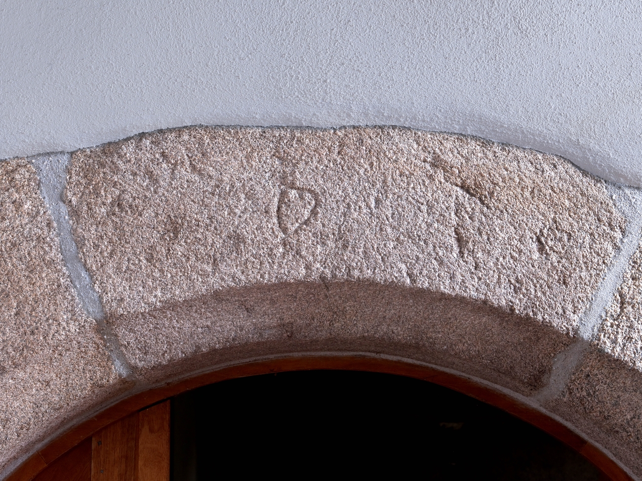 Rez-de-chaussée, salle basse actuellement vestibule, porte en arc plein cintre du mur de refend, détail des marques de tâcheronImmatriculation