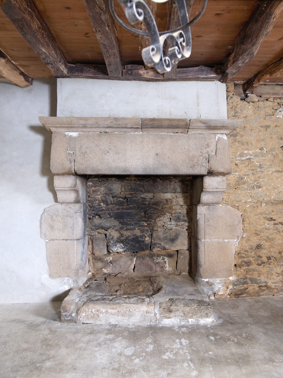 Rez-de-chaussée, salle basse sud actuellement désaffectée, détail de la cheminée monumentale : piédroits, corbelets, scourges, manteau et corniche en graniteImmatriculation