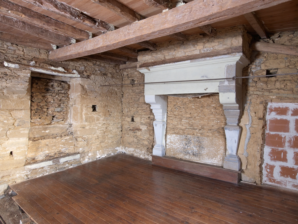 Premier étage, salle sud actuellement désaffectée (à usage probable de chambre), cheminée monumentale et fenêtre donnant vers l'est muréeImmatriculation