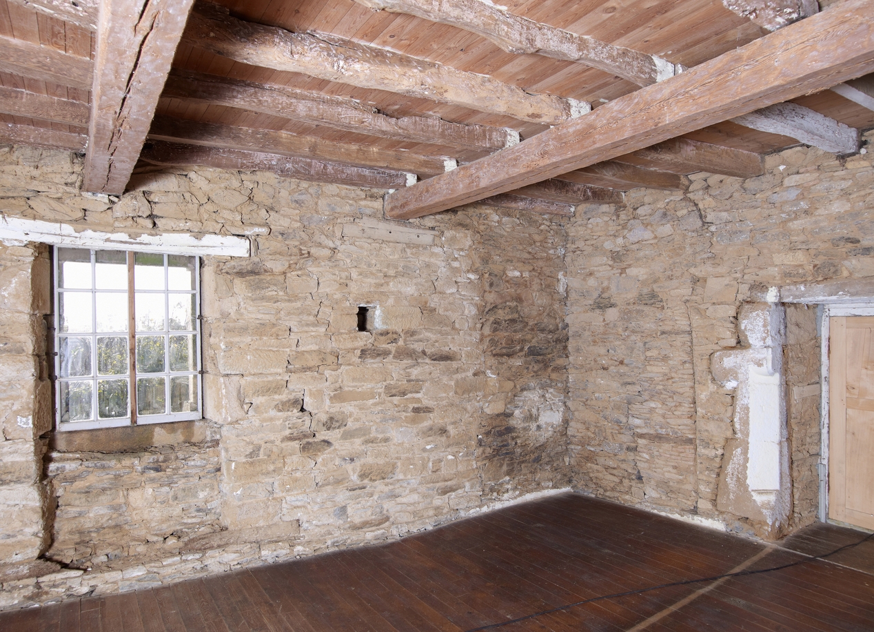 Premier étage, salle sud actuellement désaffectée (à usage probable de chambre), angle ouest, emplacement de la tour d'escalier. A droite : porte percée dans le mur de refend nord. A gauche, fenêtre ouest donnant sur la courImmatriculation