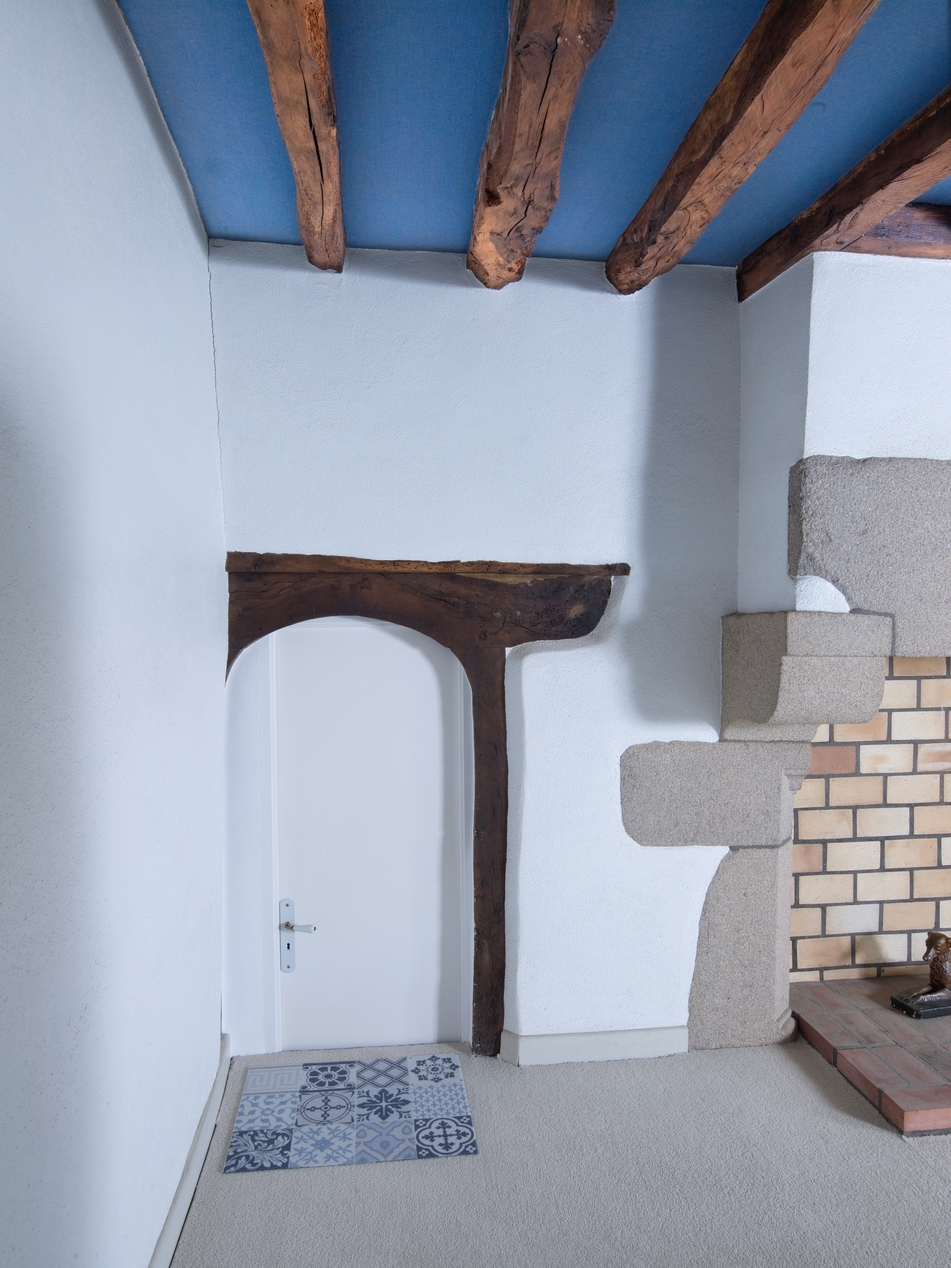 Premier étage, chambre nord (située au-dessus du cellier), accès aux latrines (actuellement salle de bain), bâti dormant de porte en bois en arc plein cintreImmatriculation