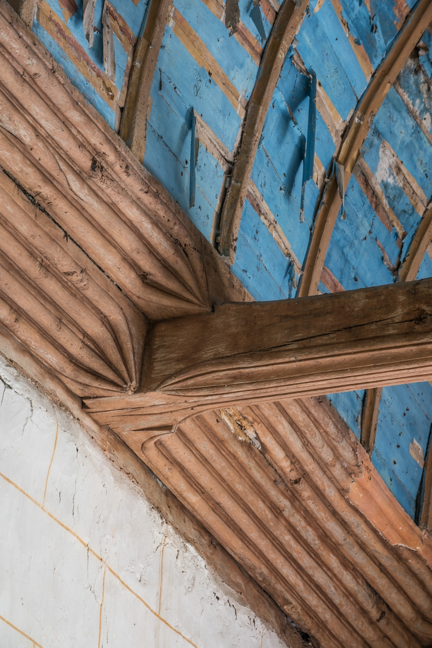 Détail d'une poutre et des sablières sculptées en sifflet du 16e siècle.Immatriculation