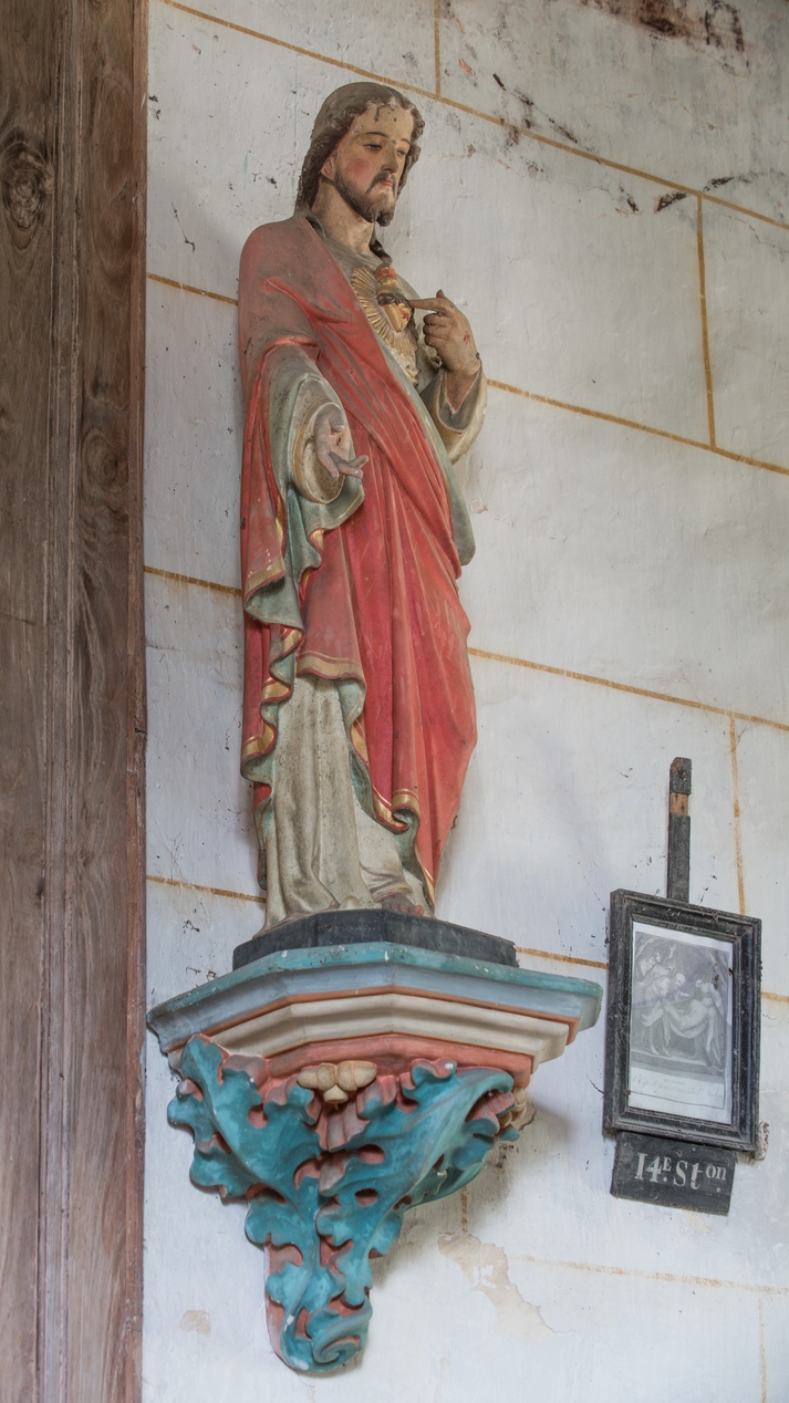 Statue en plâtre polychrome du Sacré Coeur sur une applique en plâtre peint du 19e siècle.Immatriculation