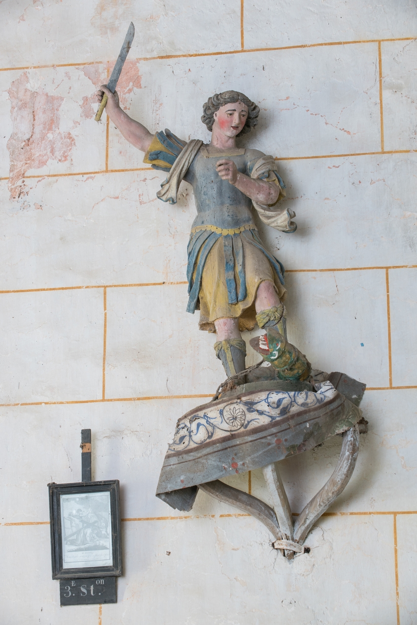 Statue en bois polychrome de Saint-Michel terrassant le dragon sur une applique en bois peint, vue frontale.Immatriculation