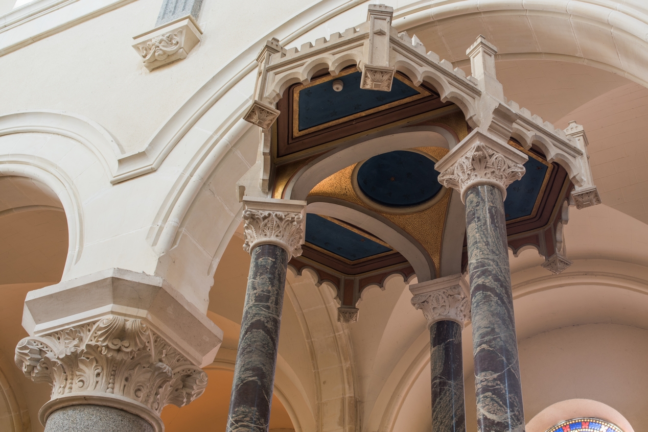Le décor du dais de la chaire à prêcher et l'un des chapiteaux sculptés de motifs végétaux tandis que la console de l'arc doubleau représente une figure.Immatriculation