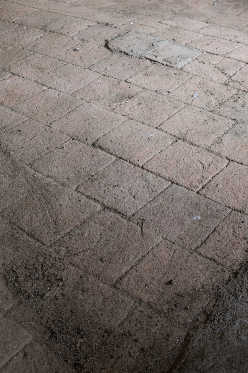 Logement de domestique aménagé dans la grange. Chambre de l'étage. Détail du sol revêtu de tomettesImmatriculation