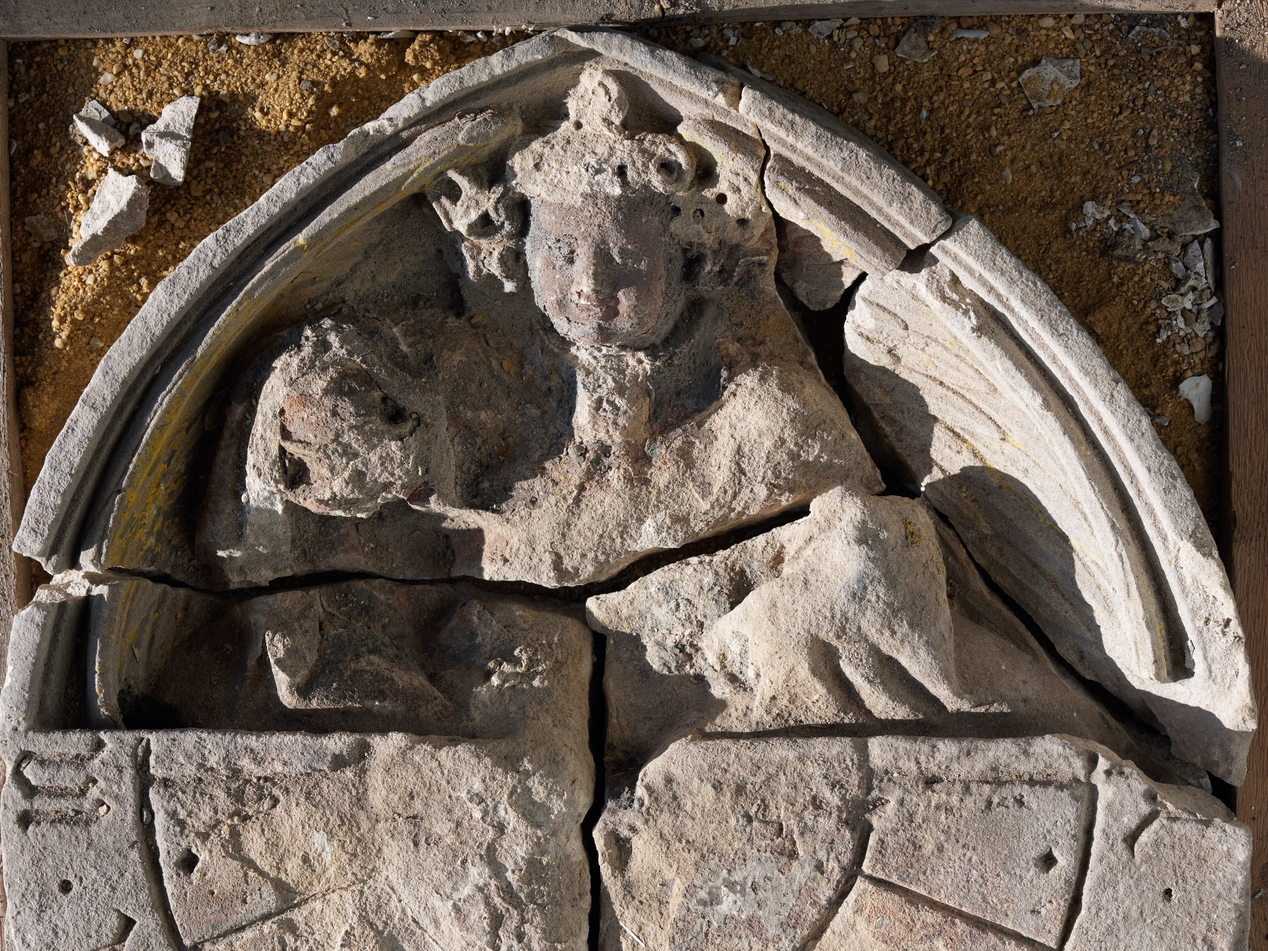 Cadran solaire gnomonique en calcaire, détail de l'ange surmontant le cadran (des traces de polychromie sont visibles)Immatriculation