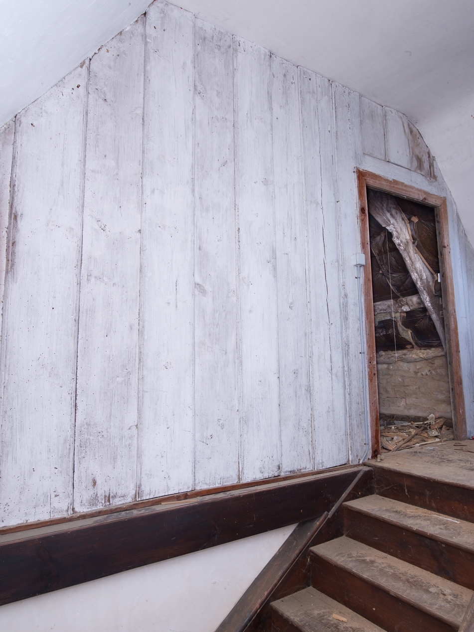 Minihy-Tréguier, 9 rue du Bourg : logis principal, étage de comble, détail de l'escalier tournant à rampe et cloison en bois abritant une ancienne chambreImmatriculation